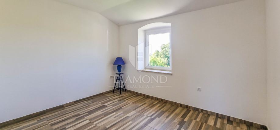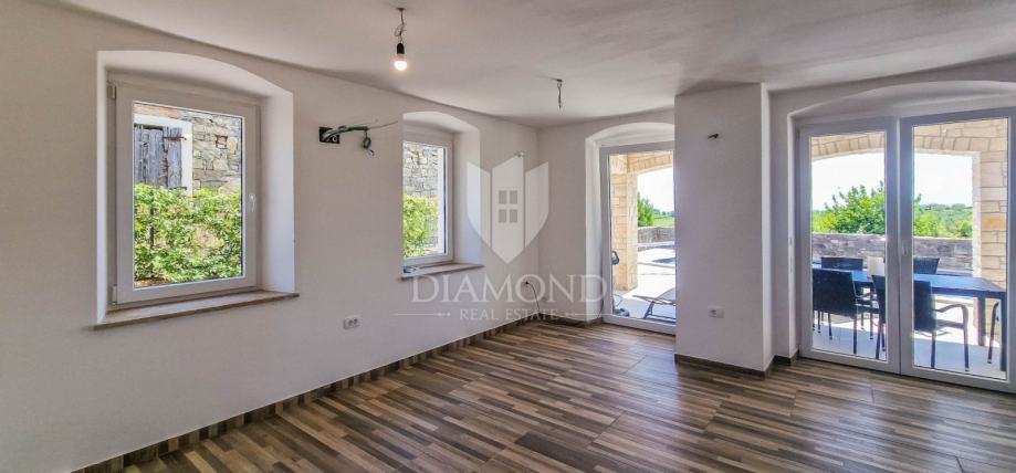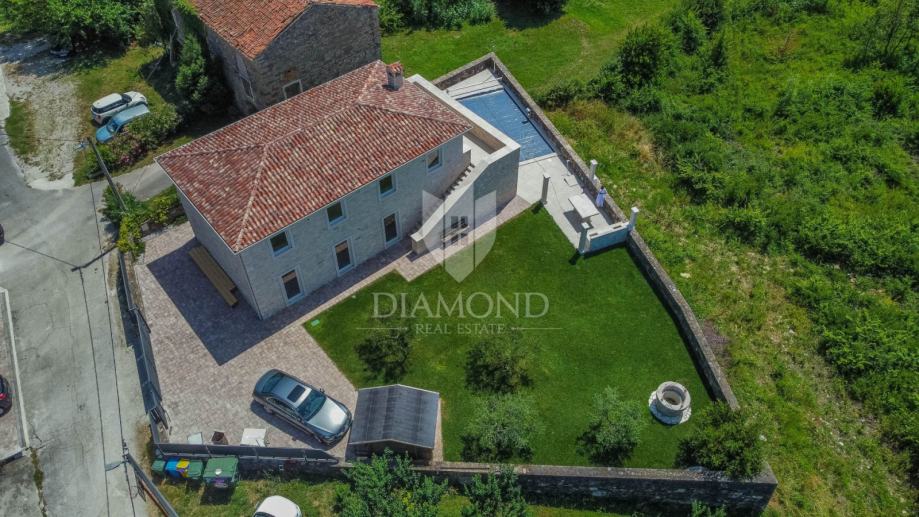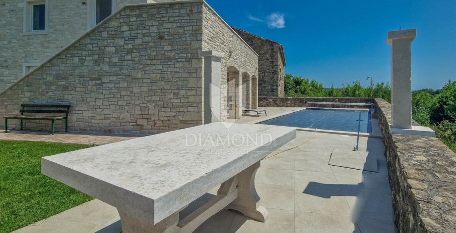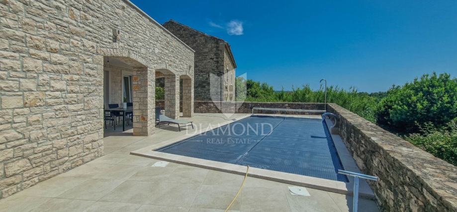 U vanjskom dijelu nalazi se bazen okružen kamenim oblogama, idealan za ljetno osvježenje i druženja, dok je okućnica pažljivo uređena kako bi pružila privatnost i udobnost.