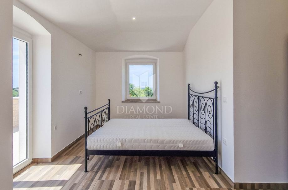 Na katu se nalaze tri prozračne spavaće sobe, svaka s vlastitom kupaonicom.. S kata se pruža očaravajući panoramski pogled na zelenilo, okolna brda i Jadransko more na horizontu – prizor koji svakodnevno oduzima dah.