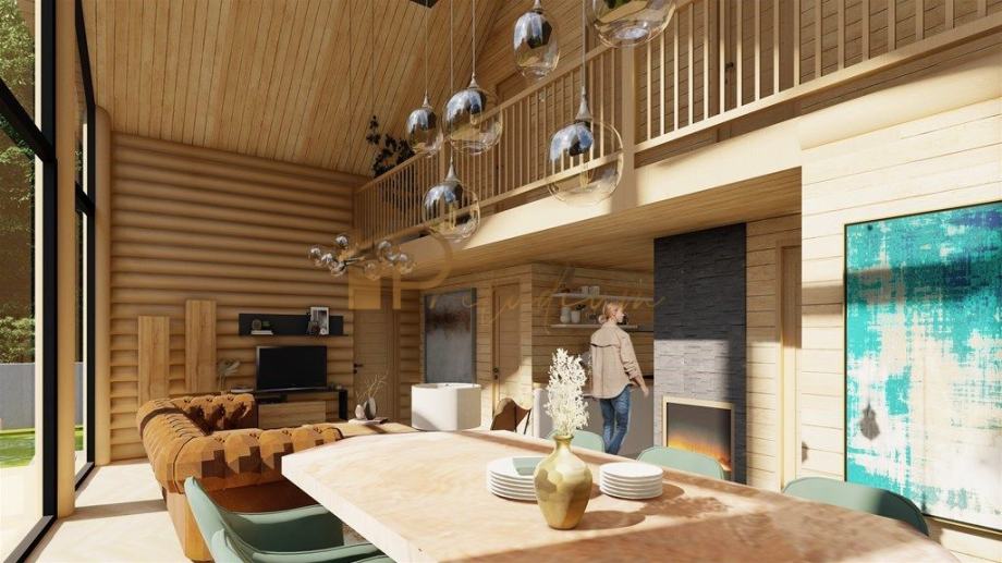 Ponosno nudimo na prodaju prekrasnu novogradnju - kuću izrađenu kompletno od strojno obrađenih trupaca/oblica, promjera 23 cm. Ova jedinstvena kuća nalazi se na izuzetno atraktivnoj lokaciji u vikend naselju Vrelo u Fužinama, neposrednoj blizini jezera Bajer i Lepenice.
