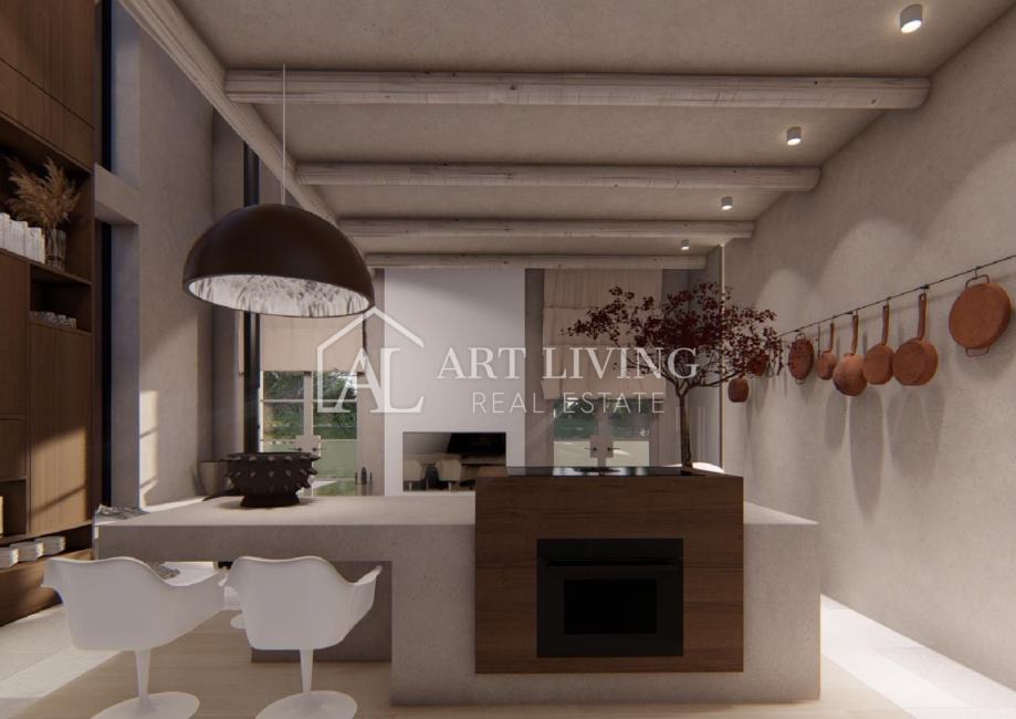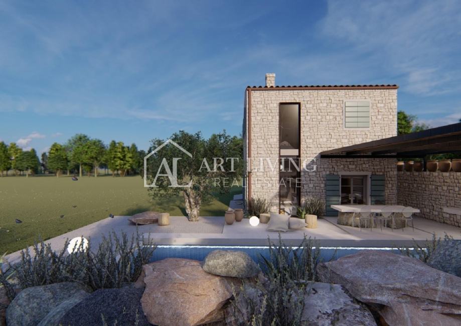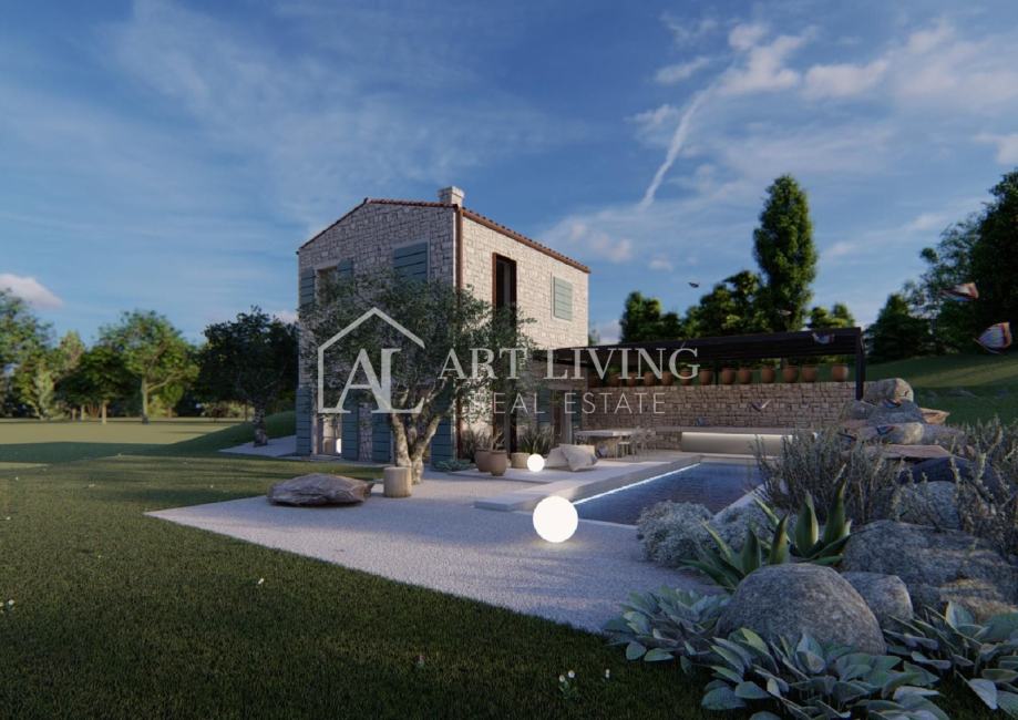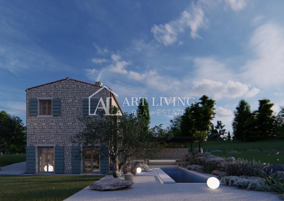 Prodaje se iznimna kamena kuća s modernim detaljima na zemljištu površine 20.000 m2. Kuća je smještena na mirnoj lokaciji okružena prirodom bajkovitog istarskog krajolika.