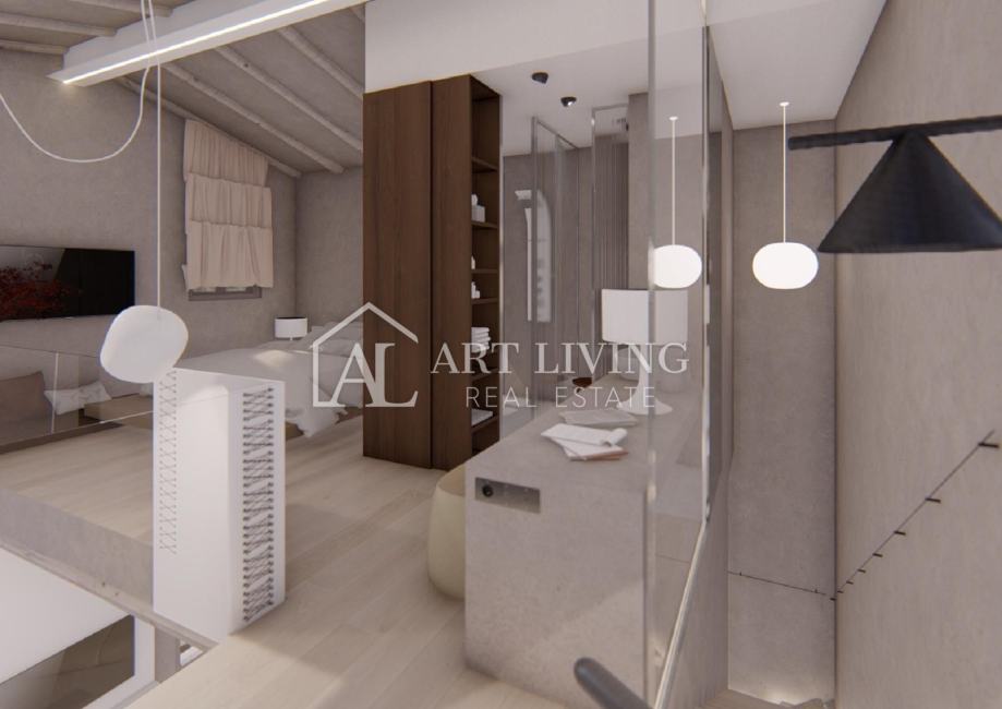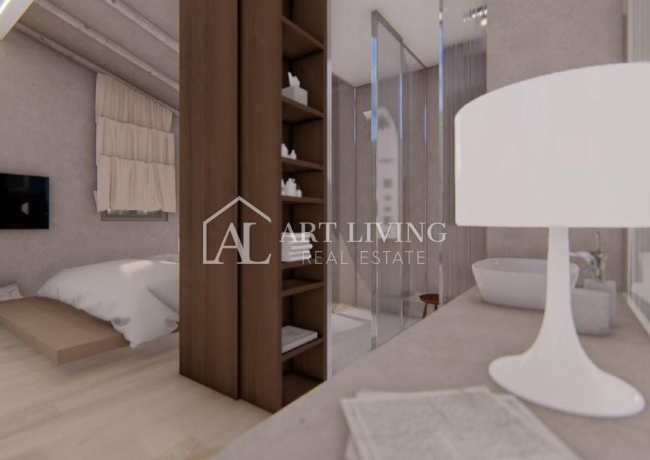 Ova jedinstvena kuća ukupne površine 89 m2 sastoji se od dvije etaže, prizemlja i kata. U prizemlju je smješten dnevni boravak s blagovaonicom i kuhinjom otvorenog tipa te jedan wc. Unutarnje stepenice vode na kat gdje se nalazi spavaća soba s vlastitom kupaonicom (master room) i vlastitom natkrivenom terasom.