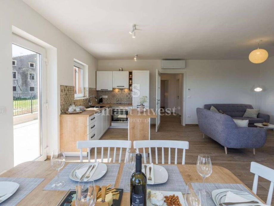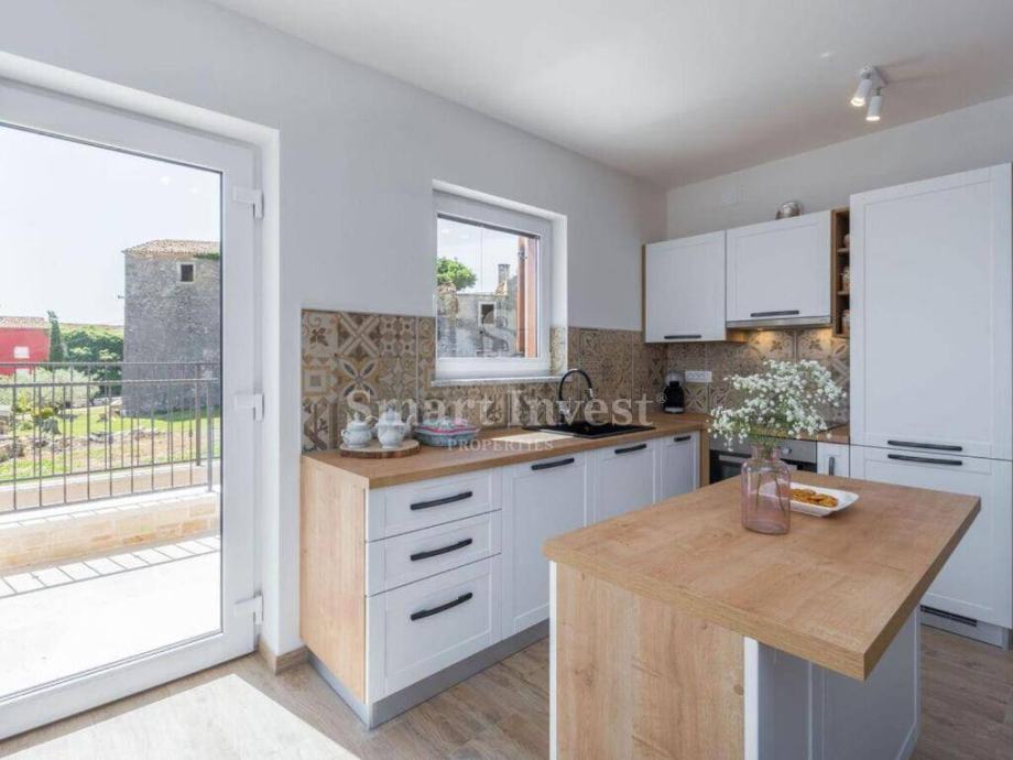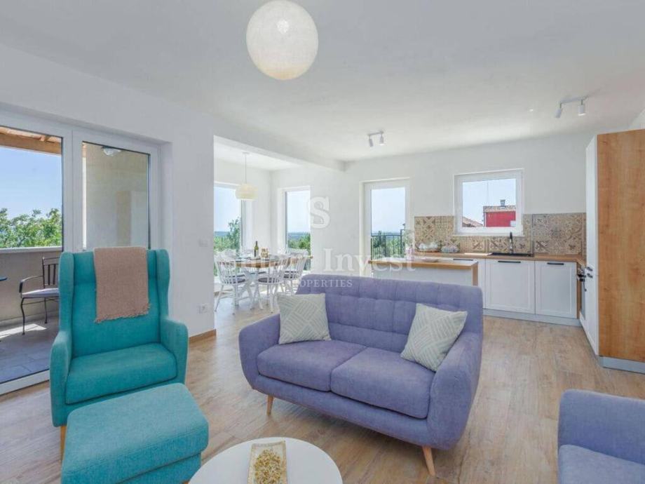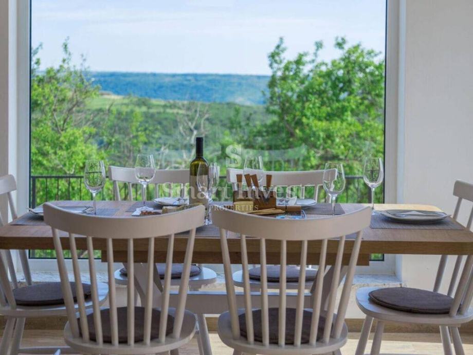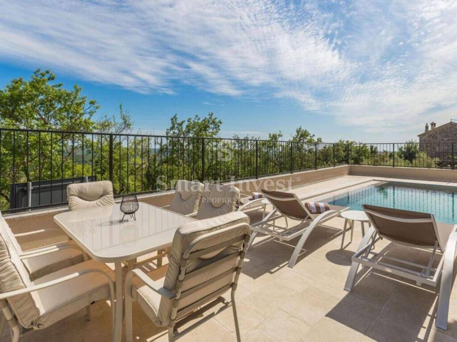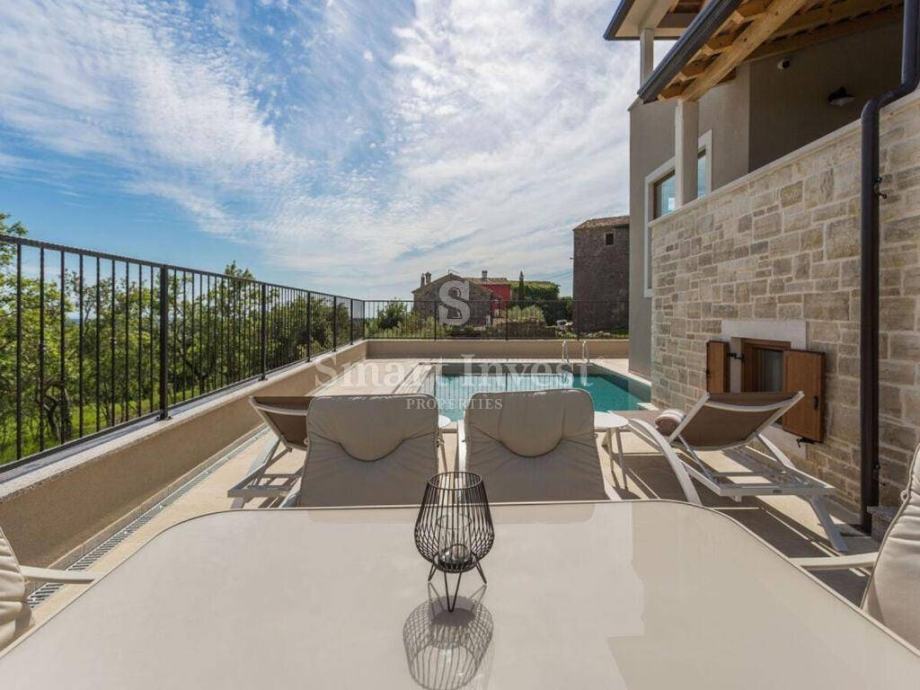 Lijepa nova kamena villa moderne gradnje sa tradicijskim istarskim elementima smještena je u mirnom selu okružena zelenilom i s pogledom na more.