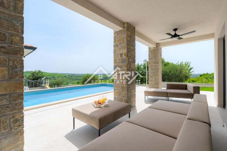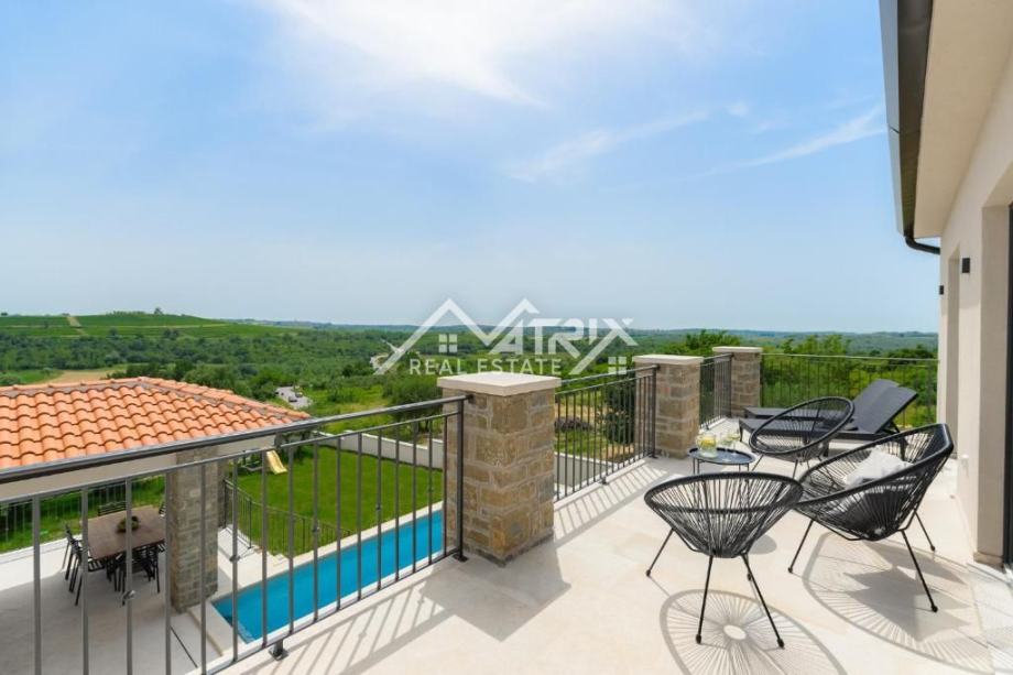 Na zapadnom dijelu Istre, u mirnoj zoni šire okolice Buja, smjestila se ova elegantna i moderno uređena vila koja nudi izniman pogled na okolne vinograde, maslinike i more.