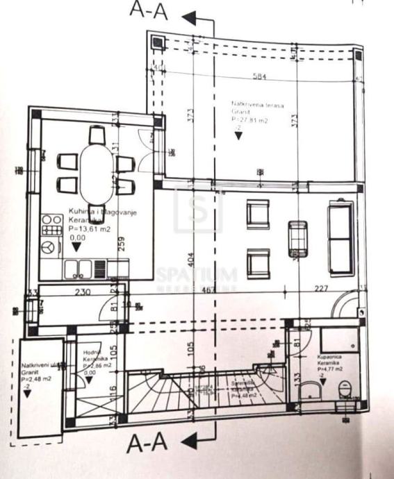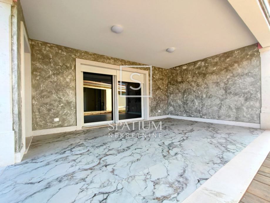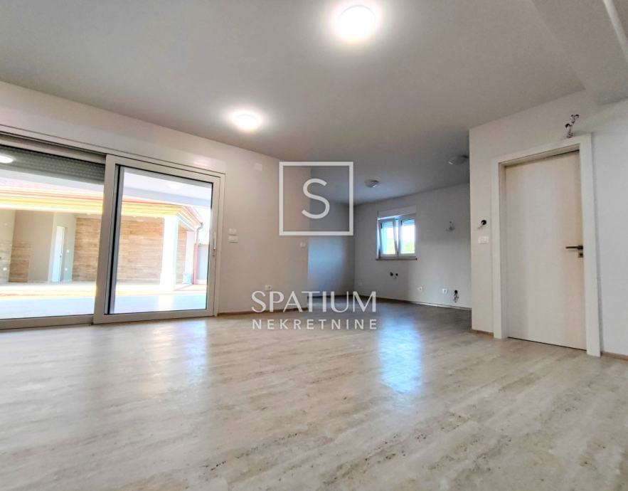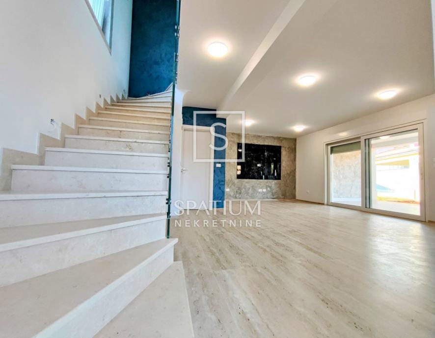Kuća se prostire na dvije etaže, s prozračnim dnevnim prostorom koji kroz velike staklene stijene povezuje unutrašnjost s natkrivenom terasom i bazenom, stvarajući prostor idealan za opuštanje i boravak na otvorenom. Na katu se nalazi glavna spavaća soba s vlastitom kupaonicom, dok dvije dodatne sobe dijele zajedničku kupaonicu. Sve sobe imaju izlaz na prostranu terasu s pogledom na uređeni vrt.