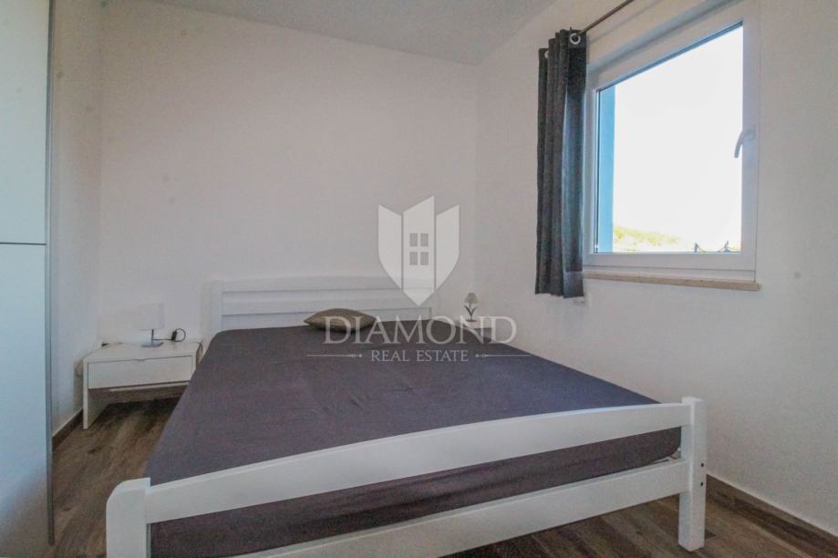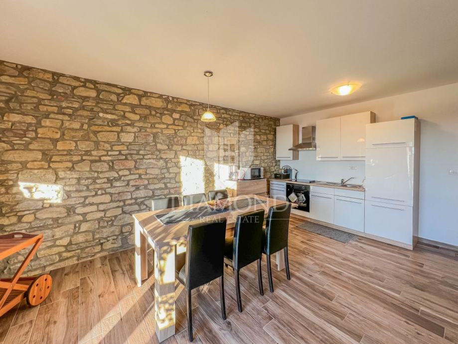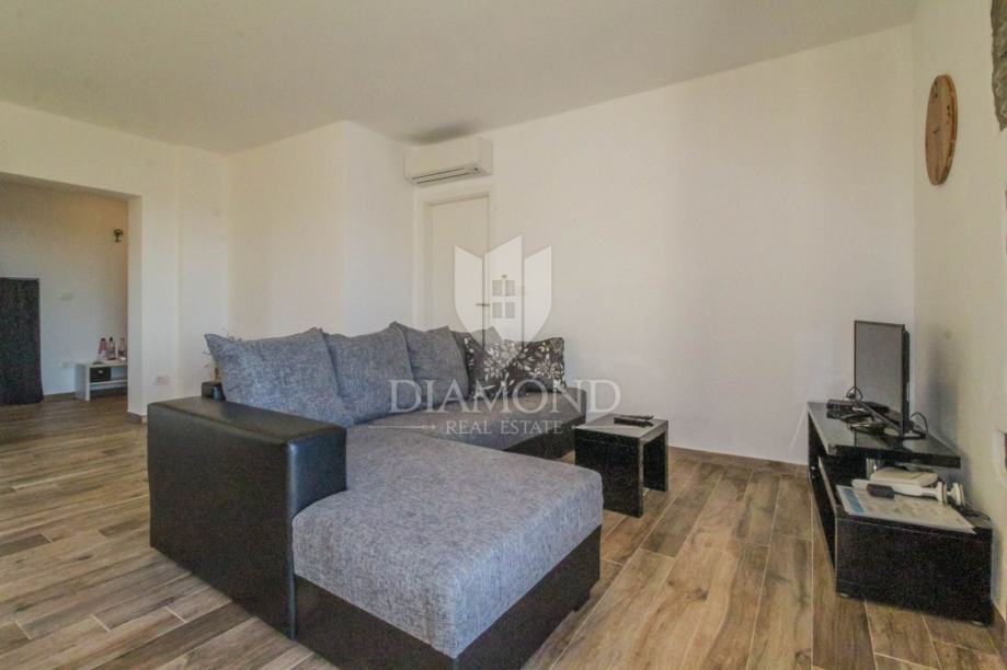 Radi se o kući u nizu površine 227 m2. Kuća se proteže kroz prizemlje, 1.kat i 2.kat. Prizemlje je u roh bau fazi i može se dovršiti i opremiti ovisno o želji kupca. Iz prizemlja se izlazi na prostranu terasu. Lijepi pogled se pruža čak i sa prizemlja. Na katu se nalazi uređeni stan koji se sastoji od dnevnog boravka zajedno sa kuhinjom i blagovaonicom, 2 spavaće sobe, kupaonice i hodnika. Iz dnevnog boravka se izlazi na prostrani balkon idealan za uživanje u predivnom pogledu na more i lijepi istarski krajolik. Na 2.katu se nalazi još jedan stan u roh bau fazi. Dovršenjem prizemlja i 2.kata, novi vlasnik bi potencijalno mogao dobiti 3 zasebne stambene jedinice.