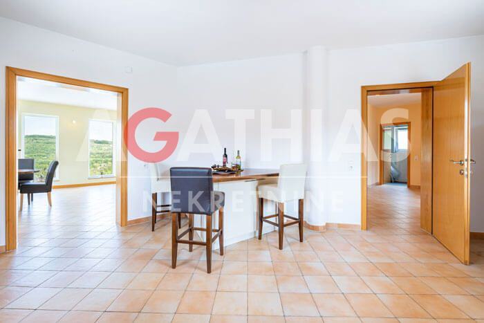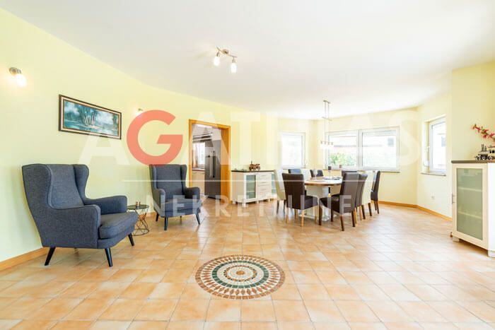 Prizemlje donosi dojam otvorenosti i svjetlosti zahvaljujući prostranoj dnevnoj sobi s izlazom na terasu i sunčalište. Ovdje se također nalaze velika kuhinja s ostavom, blagovaonica, predsoblje, WC, pomoćna prostorija te trijem i vjetrolov koji upotpunjuju ovu funkcionalnu cjelinu.