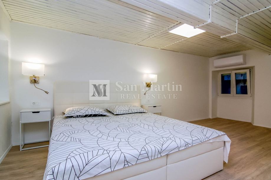 Stan se nalazi na 3. katu starije zgrade. Sastoji se od većeg ulaznog hodnika sa lijepim ormarima rađenim po mjeri, dnevnim boravkom sa kuhinjom i blagovaonom, velike spavaće sobe, još jedne spavaće sobe i novog uređenog kupatila. Stan je kompletno renoviran i potpuno novo namješten ove, 2024. godine. Stavljeni su novi troslojni PVC prozori sa komarnicima. Na prozorima su očuvane autohtone erte.