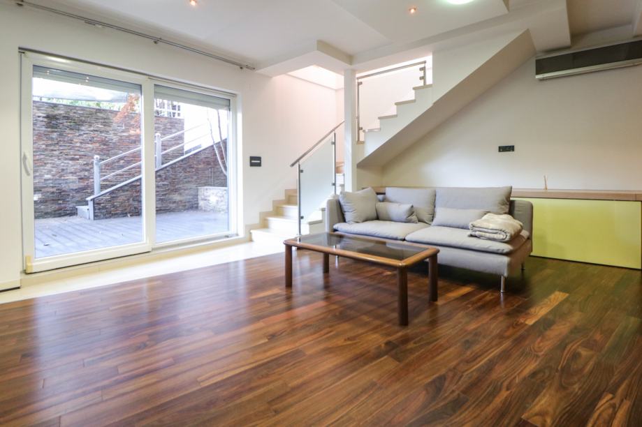 Stan je prostran, uredan i svjetao, orijentiran na sve strane svijeta osim sjevera. Stambene površine je 115,29 m2 koja se prostire na dvije etaže. PRVA ETAŽA: ulazni hodnik, dnevni boravak, kuhinja, kupaonica, dvije spavaće sobe, dva balkona DRUGA ETAŽA: dnevni boravak, spavaća soba, velika kupaonica, prostran walk-in ormar, terasa. Površina privatnog vrta/terase je 142,78 m2!