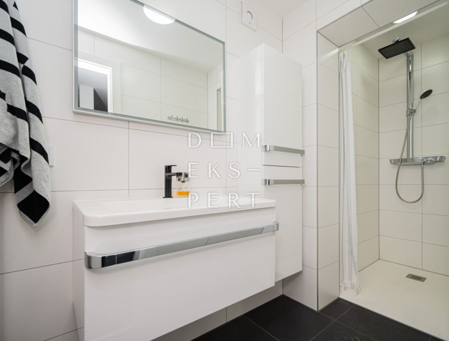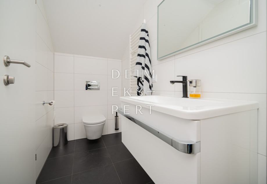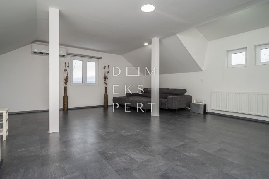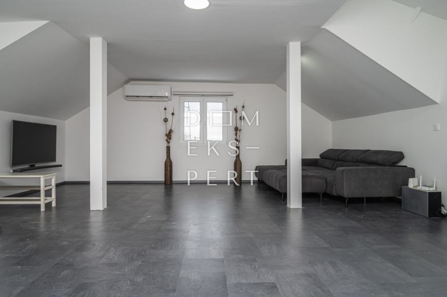 Etaže su povezane unutarnjim stubištem, a potkrovlje je uređeno kao stan.