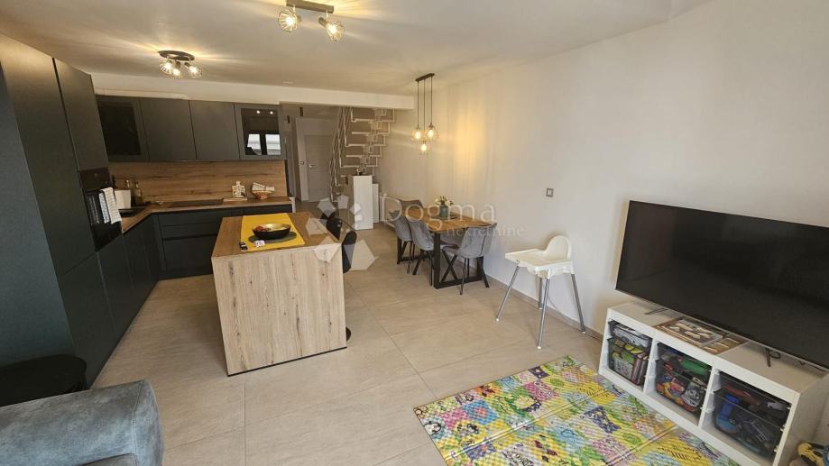 Donji dio stana čine otvoreni prostor dnevnog boravka kuhinje sa izlazom na balkon,kupaonica,manja dječja soba te veća spavaća soba.