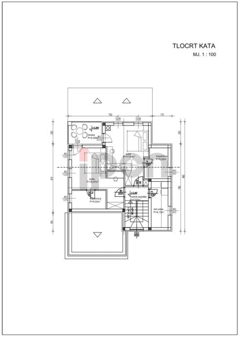 Unutarnjim stepenicama dolazi se na kat gdje se nalazi hodnik (7,76 m2) , jedna soba (16,47 m2) sa kupaonicom (5,03 m2), druga soba (17,00 m2) sa kupaonicom (5,25 m2), tehnička soba (vešeraj) od 6,15 m2 i natkrivena terasa od 6,00 m2.