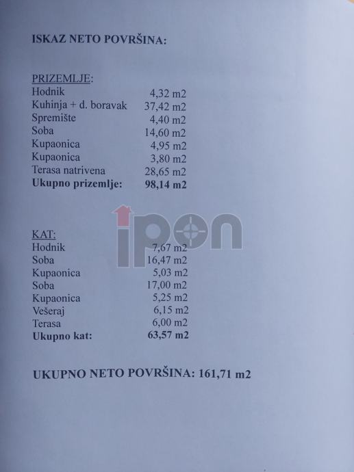 U prizemlju je hodnik (4,32 m2), kuhinja sa blagovaonicom i dnevnim boravkom (37,42 m2), spremište (4,40 m2), soba (14,60 m2) 2 kupaonice (4,95 m2 i 3,80 m2) i velika natkrivena terasa od 28, 65 m2 sa koje se pruža pogled na prostrani bazem od 32 m2.