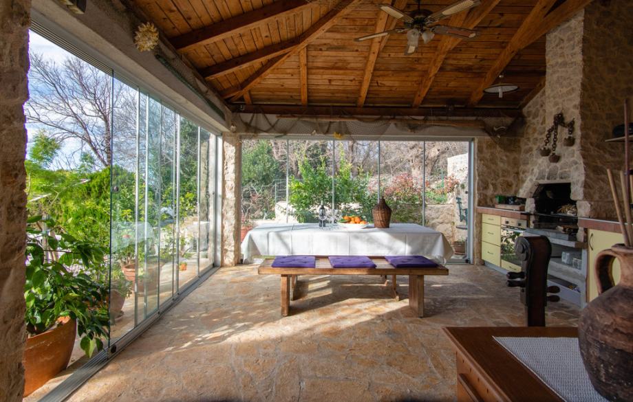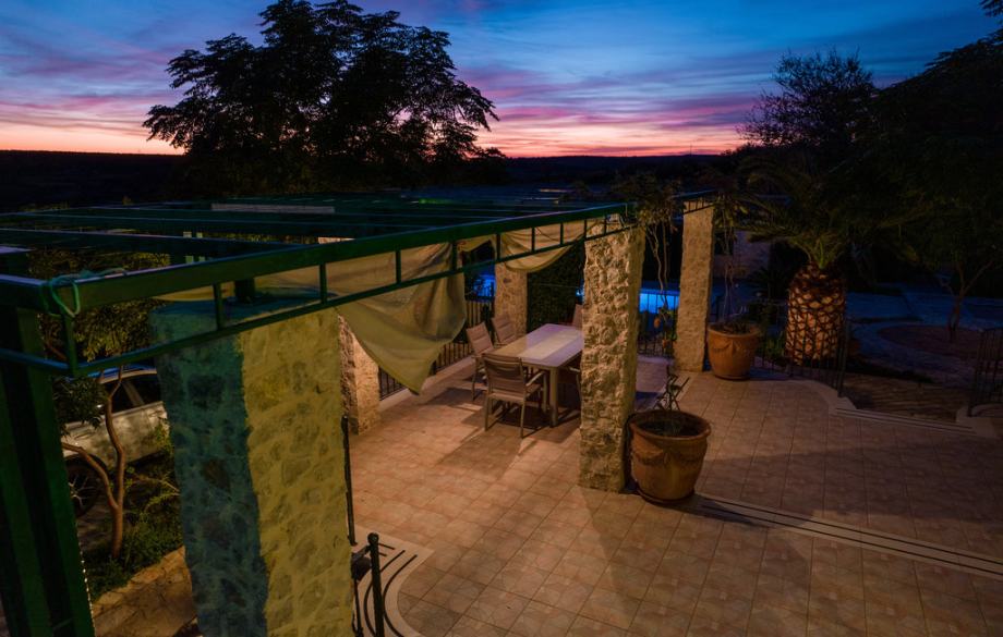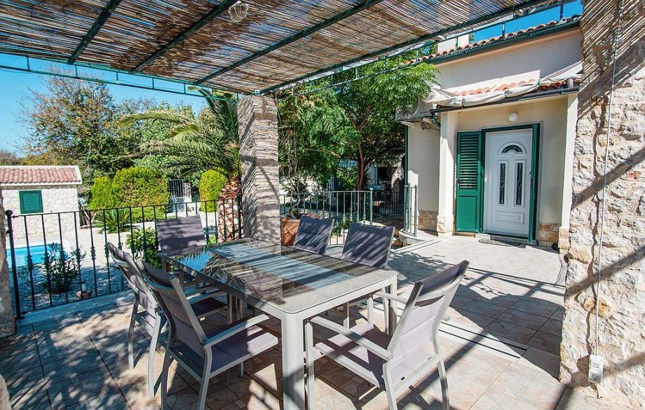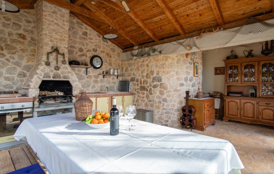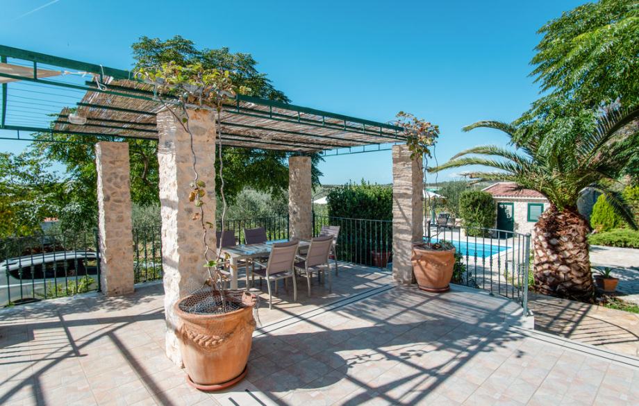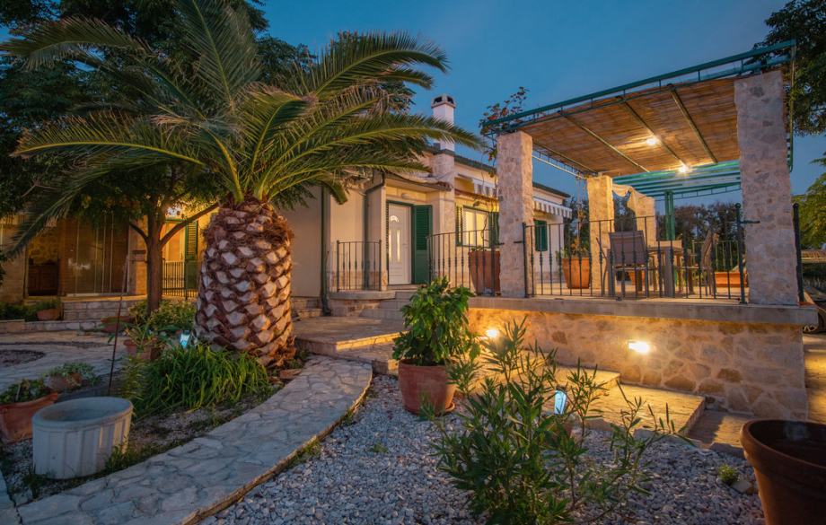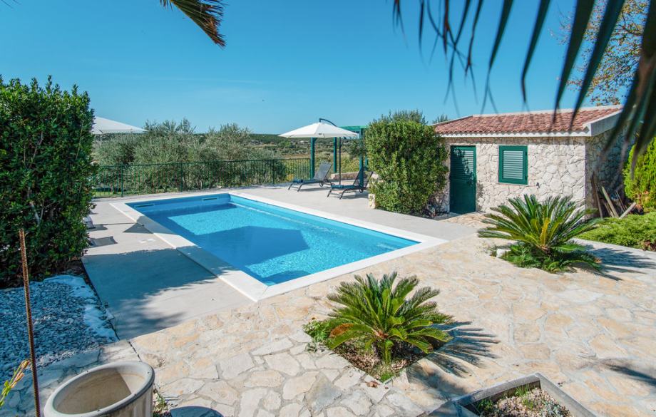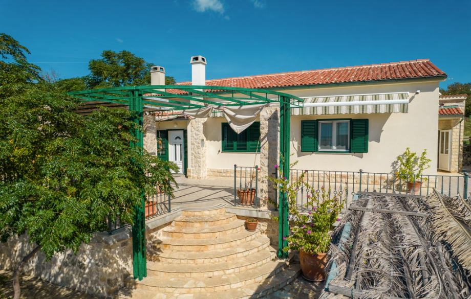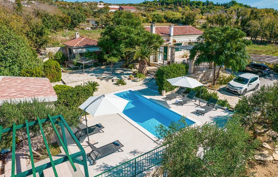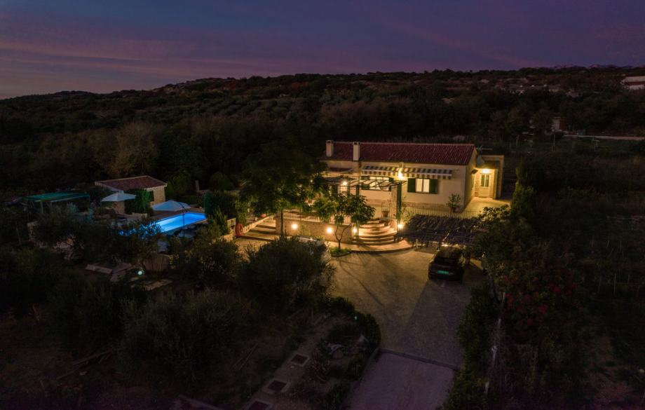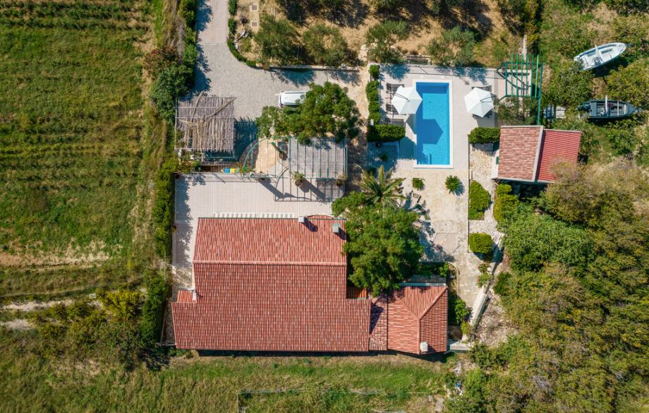 Okružuje je okućnica puna mediteranskog zelenila, površine 2898 m2 s pomoćnim objektima i nadstrešnicom 22 m2.