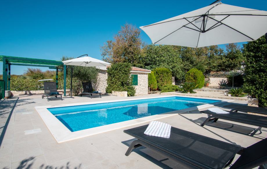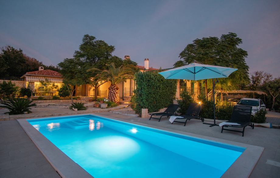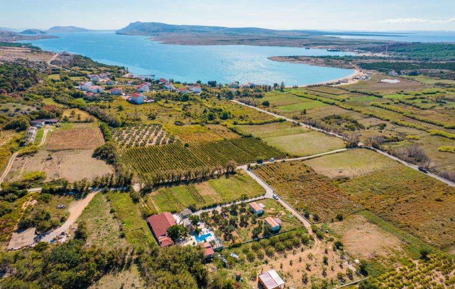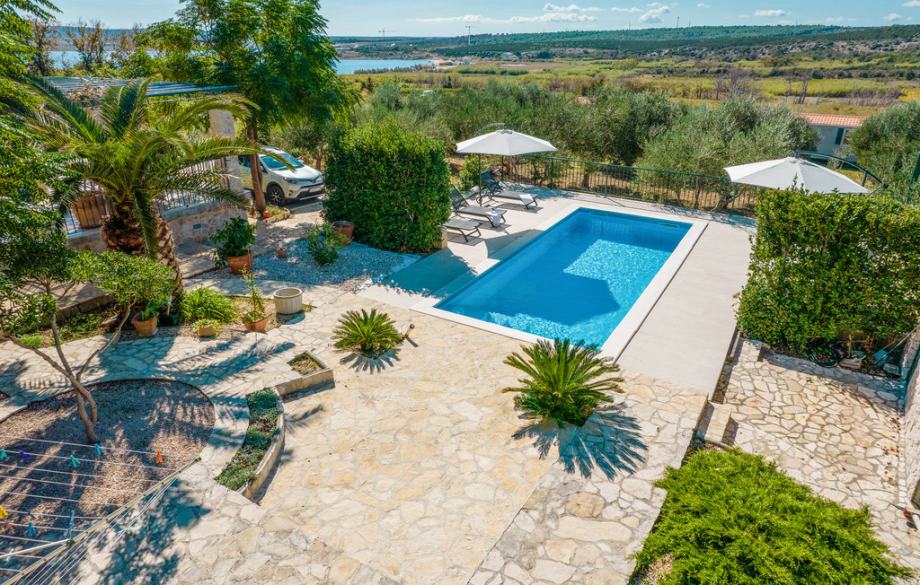 Prodaje se vila, prizemnica s bazenom s velikim, prekrasno uređenim dvorištem u mjestu Caska, nedaleko od Novalje na otoku Pagu.
