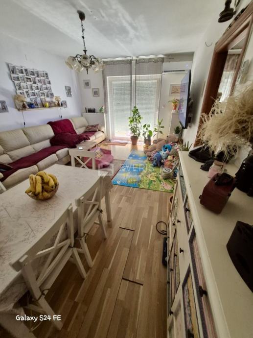 U prizemlju se nalazi jednosoban stan s kuhinjom, dnevnim boravkom i kupaonicom. Iz dnevnog boravka se izlazi na terasu od 43 m2, na kojoj je montirana nadstrešnica. Grijanje centralno na pelete (peć snage 14kw), te jedna inverter klima uređaj.