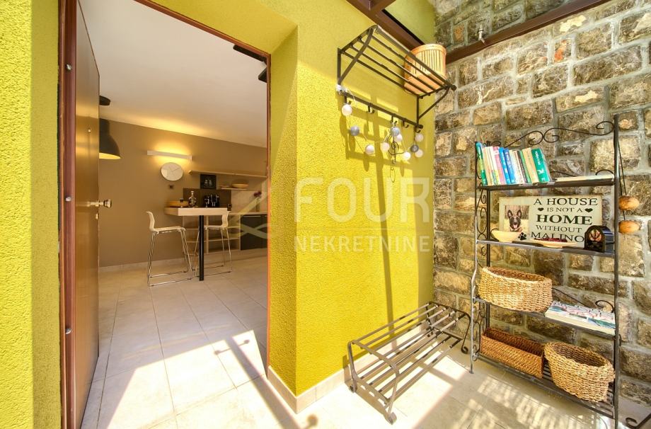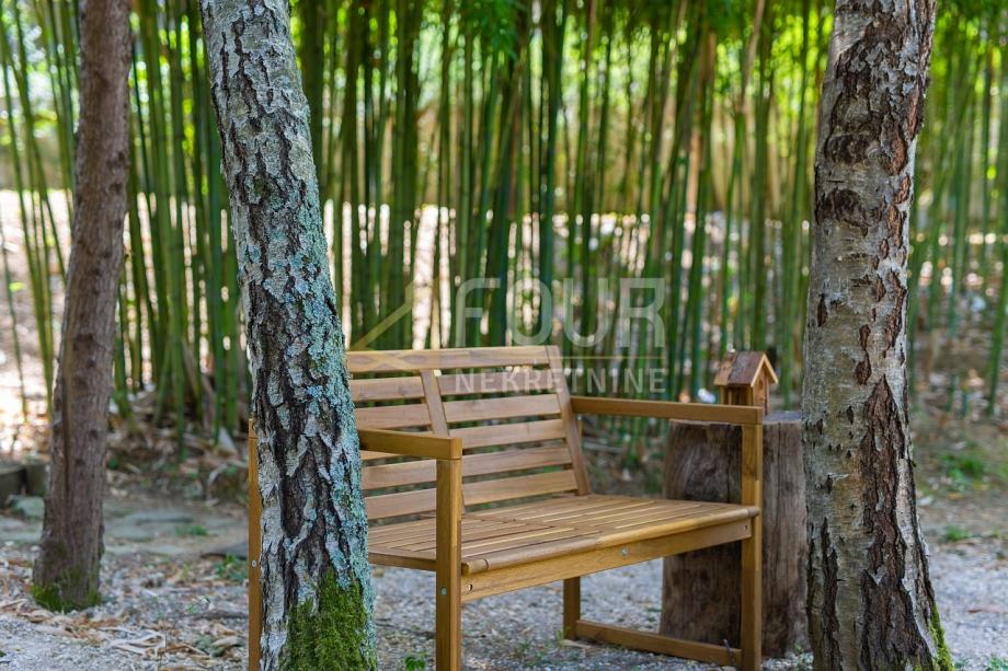 Okućnica odiše pažnjom i njegom, ukrašena raznolikim biljem i mediteranskim drvećem, a na njoj su smještene vrtna kućica od 22 m2 te pomoćni objekt od 13 m2.