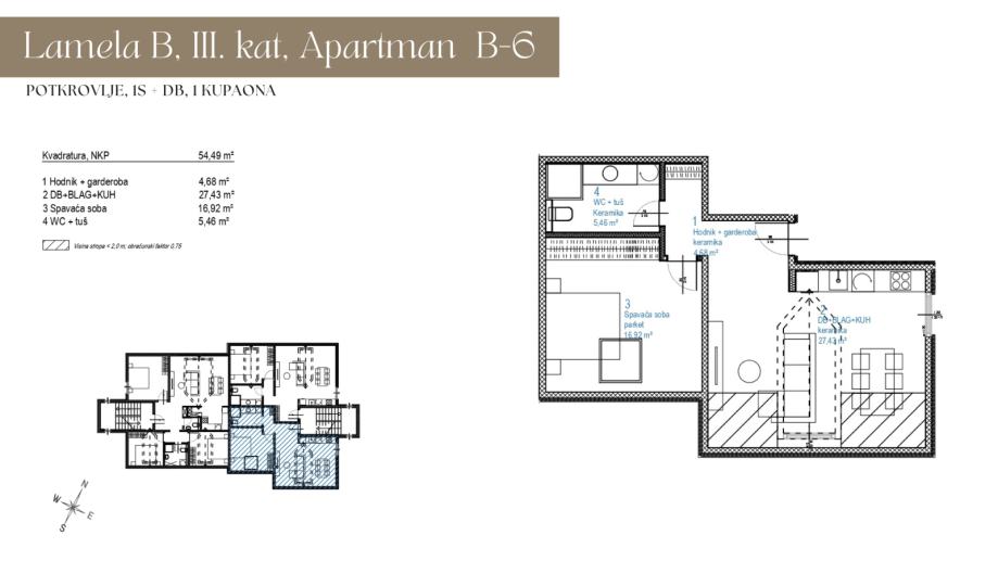 2s stan oznake B6 u potkrovlju (3. kat) manje zgrade (istočni ulaz ima ukupno 6 stanova) s 2 ulaza, te ukupno 9 stanova. Stan se sastoji od dnevnog boravka otvorenog tipa s kuhinjom i blagovaonicom, spavaće sobe, kupaonice s WC-om, hodnika i garderobe. Moguće je kupiti jedno ili više, od sveukupno 6 garažnih ili 6 vanjskih, parkirnih mjesta.