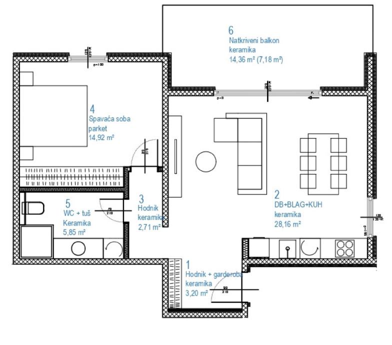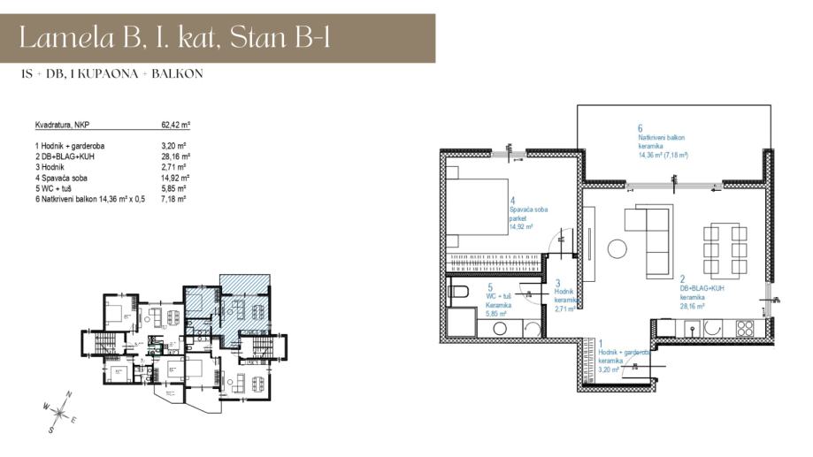 2s stan oznake B1 na 1. katu manje zgrade (istočni ulaz ima ukupno 6 stanova) s 2 ulaza, te ukupno 9 stanova. Stan se sastoji od dnevnog boravka otvorenog tipa s kuhinjom i blagovaonicom, spavaće sobe, kupaonice s WC-om, hodnika, garderobe i natkrivenog balkona. Moguće je kupiti jedno ili više od sveukupno 6 garažnih ili 6 vanjskih parkirnih mjesta.