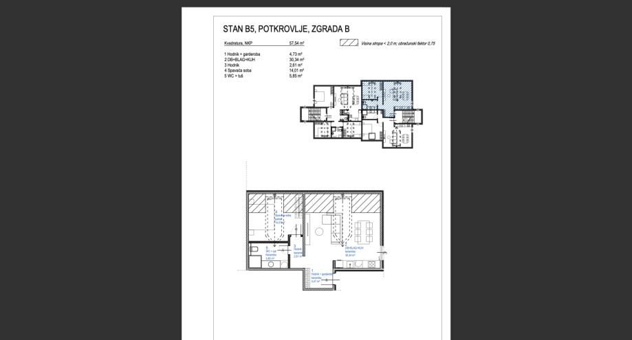 Cavtat, new building, residential unit with a net usable area of 78.19 m2 in the attic of a residential building with a parking garage space of 17.40 m2 on the ground floor of the building.Apartment B5 with a usable area of 60.79 m2 consists of a hallway with a wardrobe, a bathroom with a toilet, a...