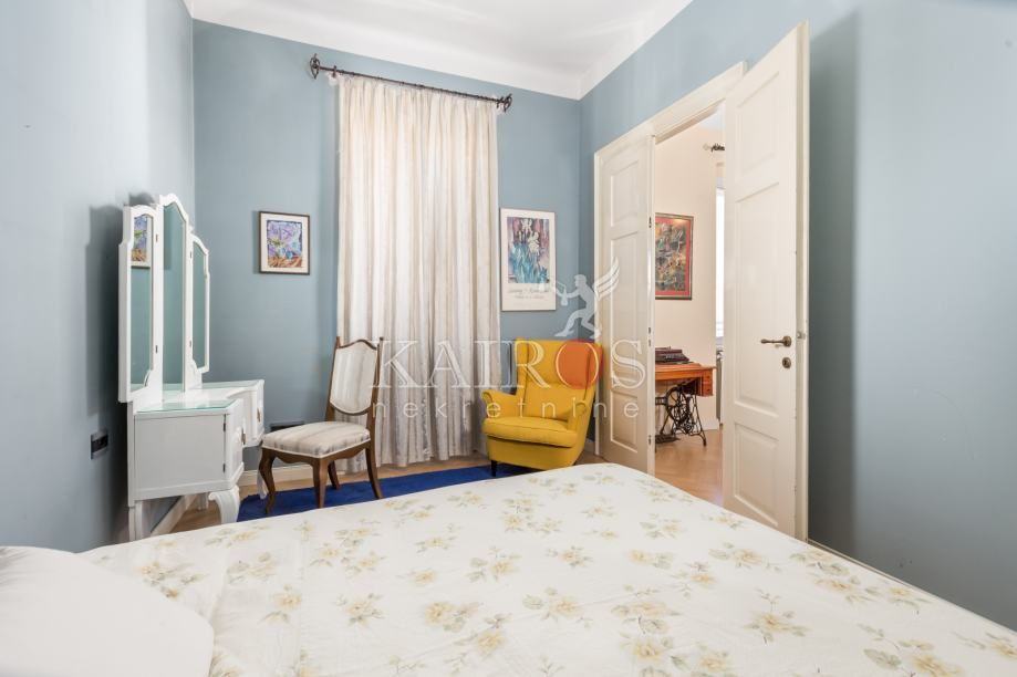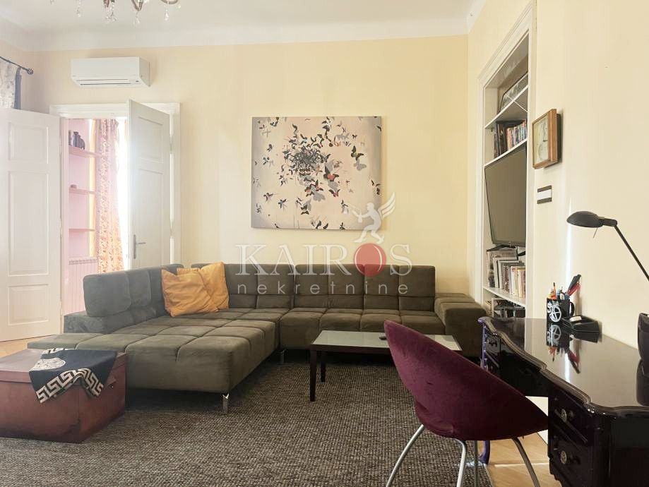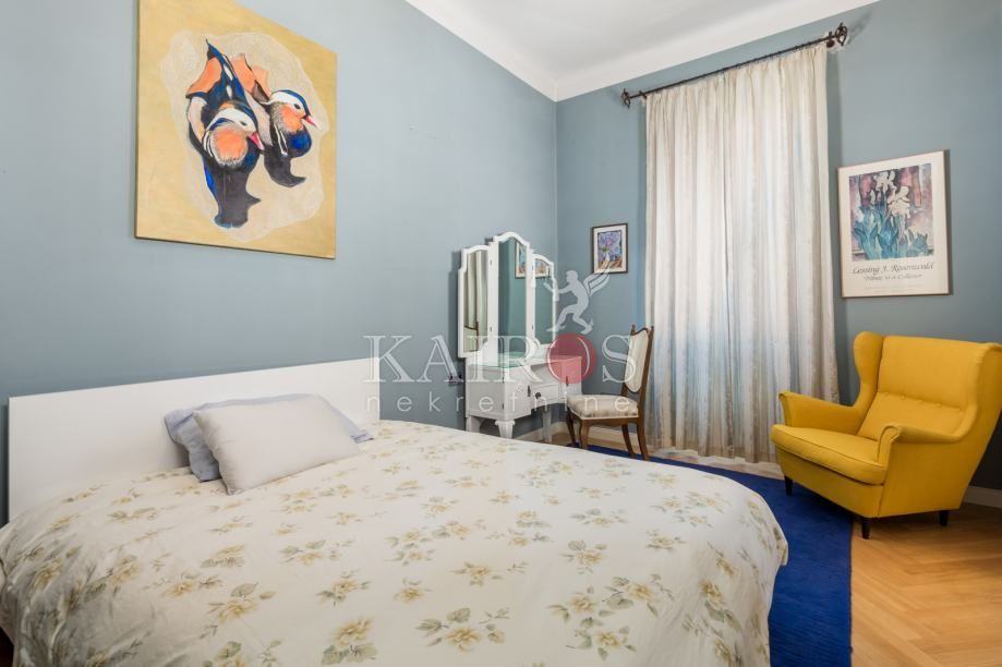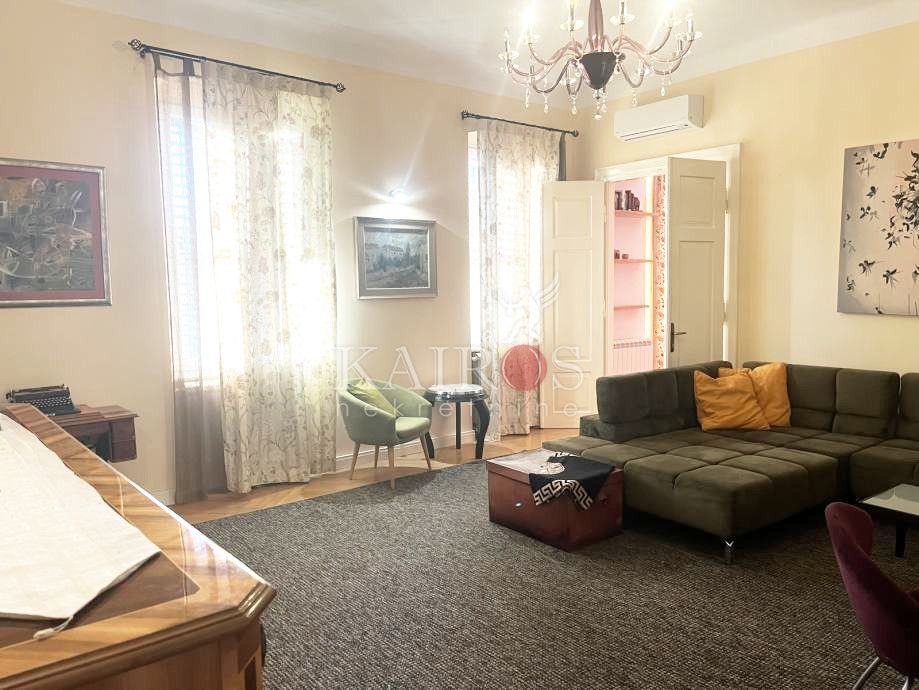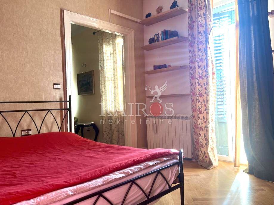 CENTAR, iznajmljujemo veliki stan trosoban s dnevnim boravkom, stan površine 119.19 m2, na 2. katu uredne stambene zgrade. Kompletno je namješten, a sastoji se od 3 spavaće sobe, dnevnog boravka, kuhinje s blagovaonicom, balkona, 2 kupaonice i zasebnog toaleta.