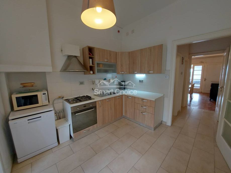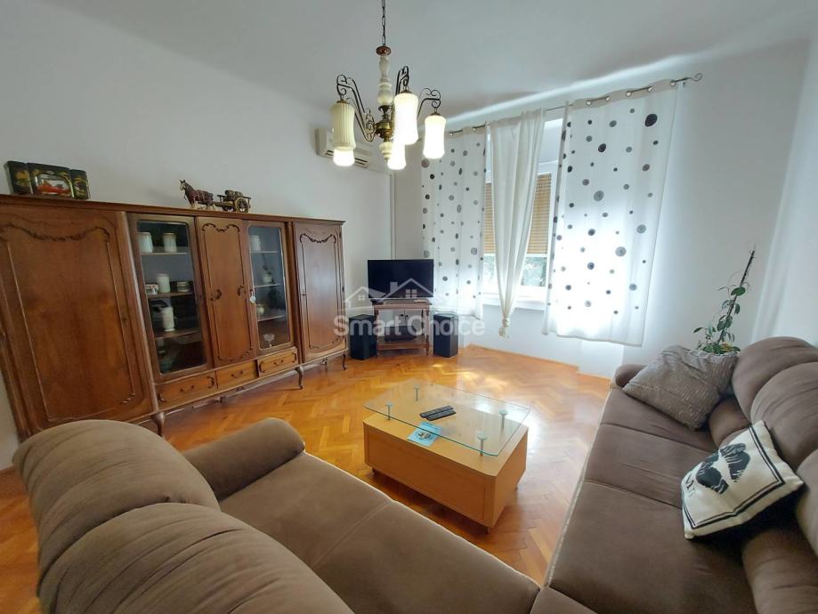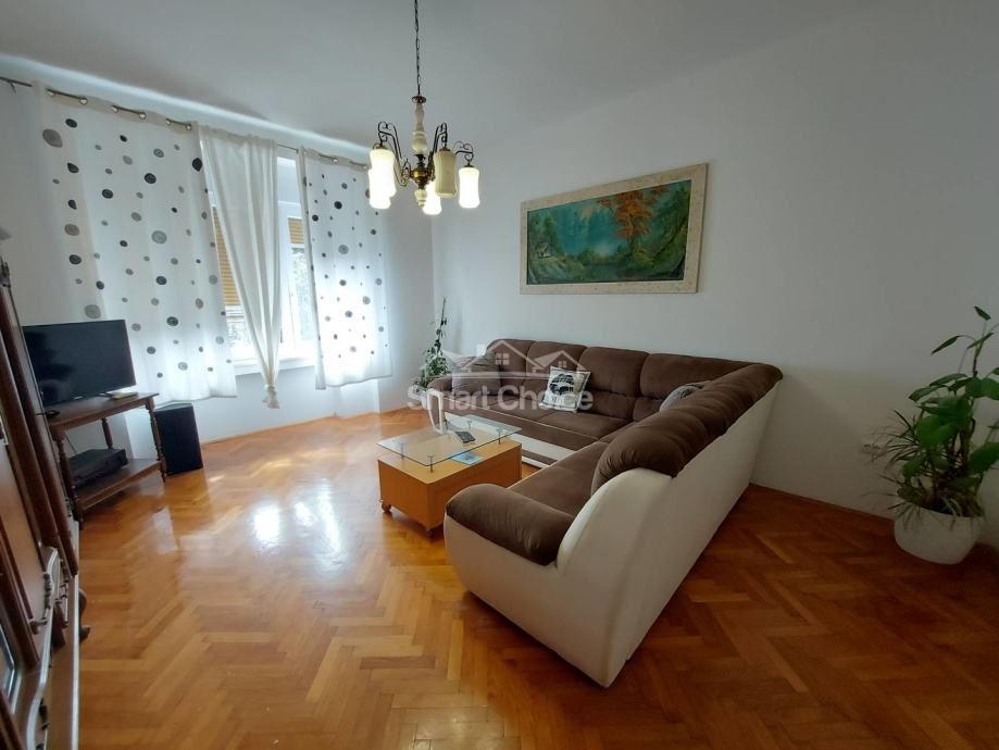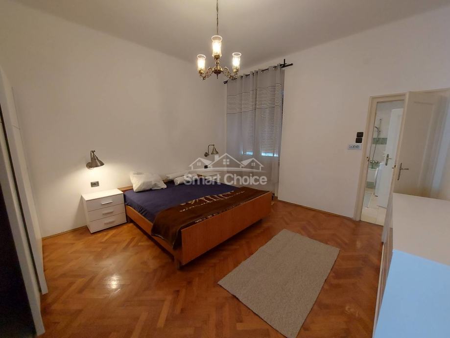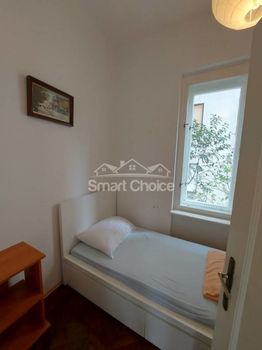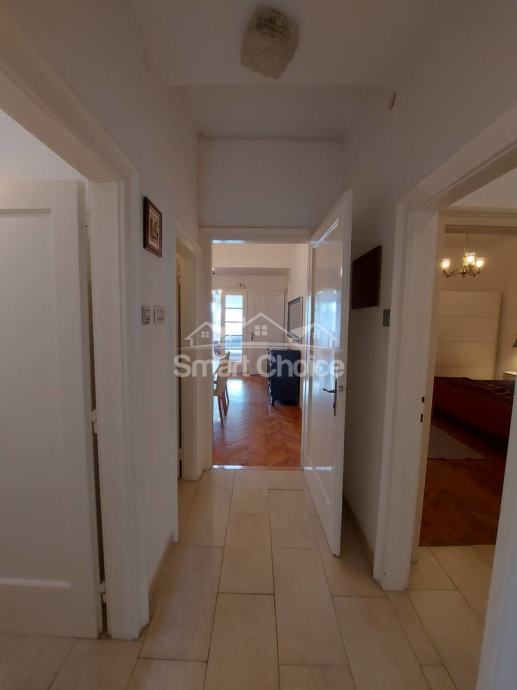 Centar - komforan trosoban stan s dnevnim boravkom na 2. katu uredne zgrade s liftom. Stan je djelomično novoadaptiran. Mogućnost najma parkinga 20m od ulaza u zgradu uz nadoplatu od EUR 100/mjesec. Stan se sastoji od prostranog dnevnog boravka, velike kuhinje, velike blagovaone, 2 velike spavaće sobe, jedne manje spavaće sobe, kupaone, wc-a, 2 balkona i špajze. Stanu pripada konoba u prizemlju zgrade. Idealno za smještaj 3-5 ljudi. Svaka soba ima TV.