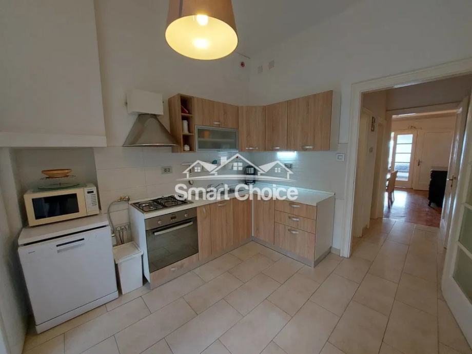 Centar - komforan trosoban stan s dnevnim boravkom na 2. katu uredne zgrade s liftom. Stan je djelomično novoadaptiran. Mogućnost najma parkinga 20m od ulaza u zgradu uz nadoplatu od EUR 100/mjesec. Stan se sastoji od prostranog dnevnog boravka, velike kuhinje, velike blagovaone, 2 velike spavaće sobe, jedne manje spavaće sobe, kupaone, wc-a, 2 balkona i špajze. Stanu pripada konoba u prizemlju zgrade. Idealno za smještaj 3-5 ljudi. Svaka soba ima TV. Prodaje se kompletno namješten.