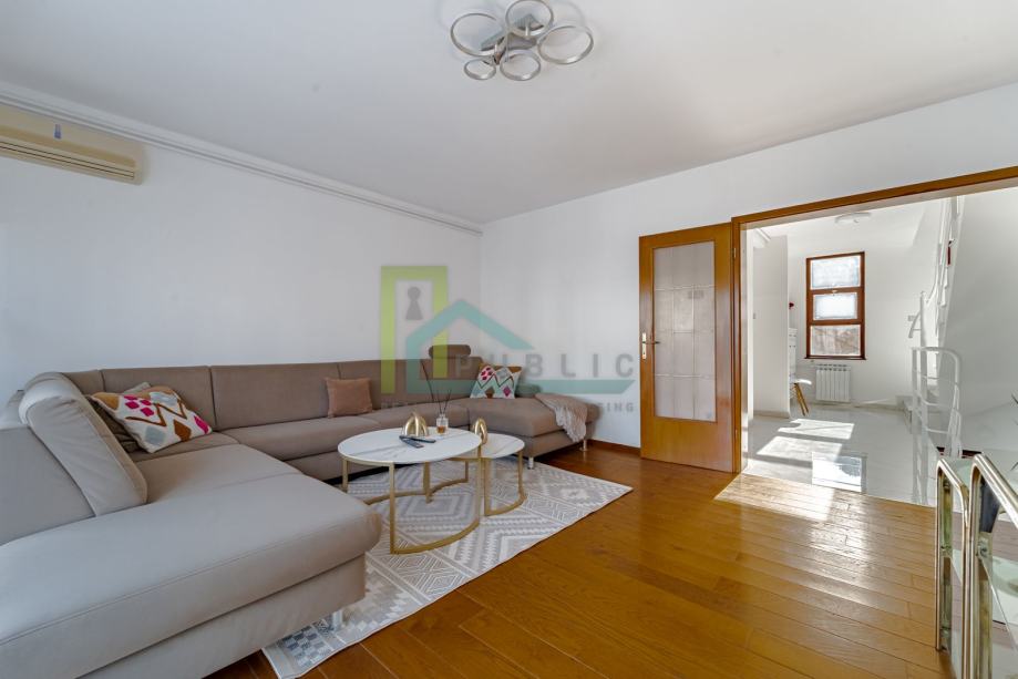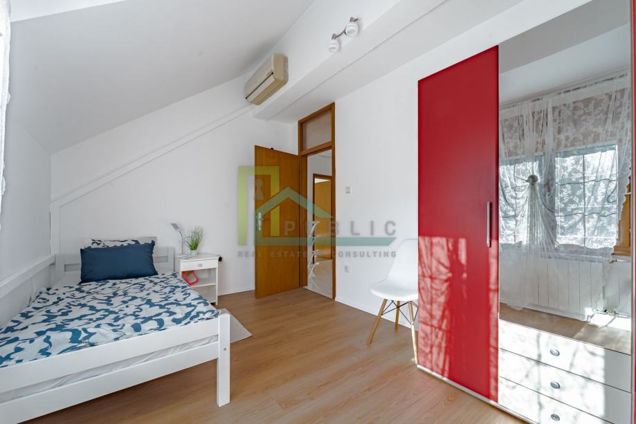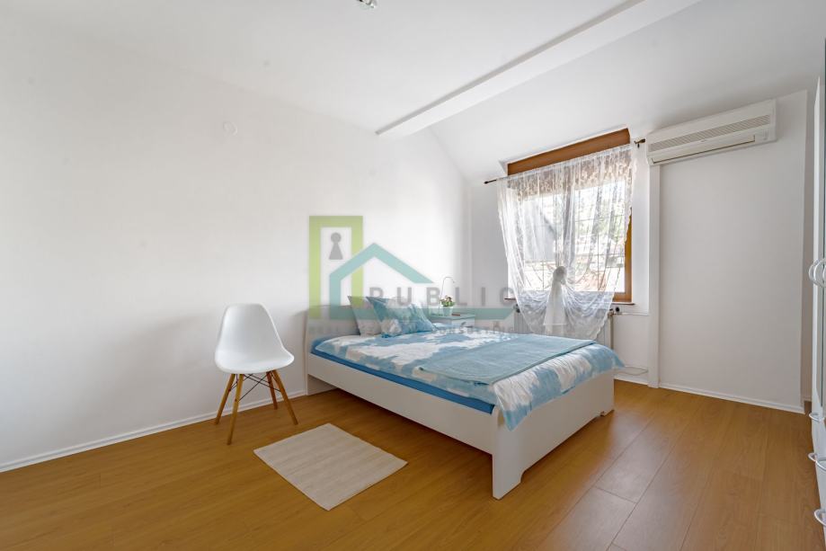 Iznajmljuje se moderan 6soban stan površine 140 m2 na prvom katu i potkrovlju manje zgrade od četri etaže na odličnoj lokaciji.