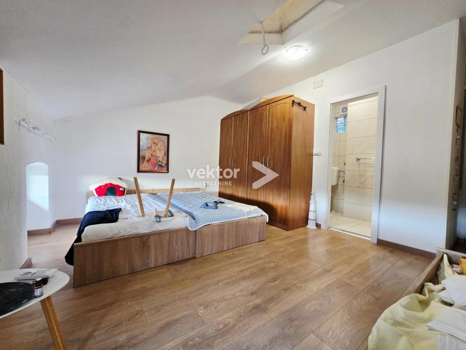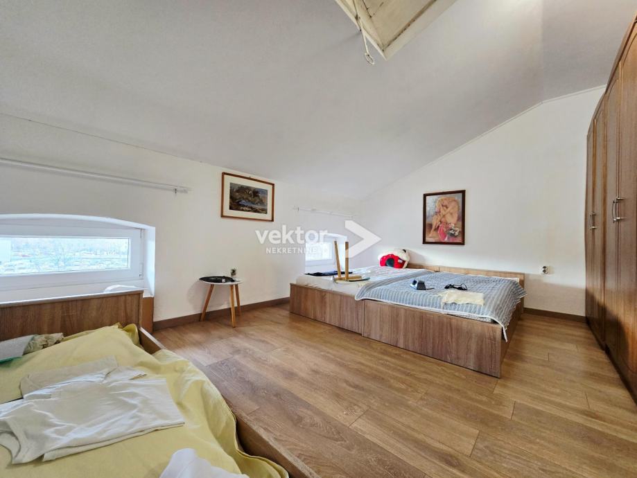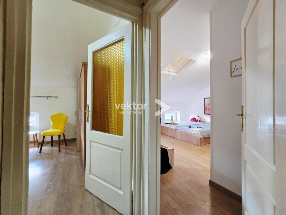Stan površine 51.50m2 ima dvije komotne sobe, kuhinju i dvije kupaonice koje su renovirane prije par godina. Iako se stan nalazi u visokom potkrovlju, visina stropa nije problem,gotovo u cijelom prostoru je standardna visina, a bočni i krovni prozori pružaju dovoljno dnevne svjetlosti.