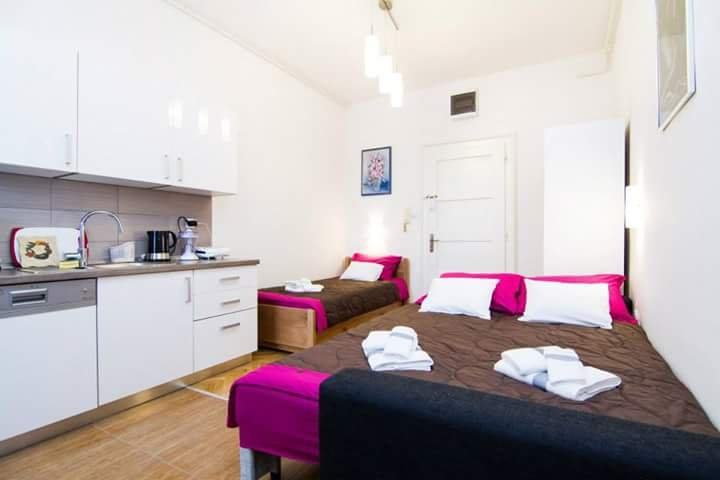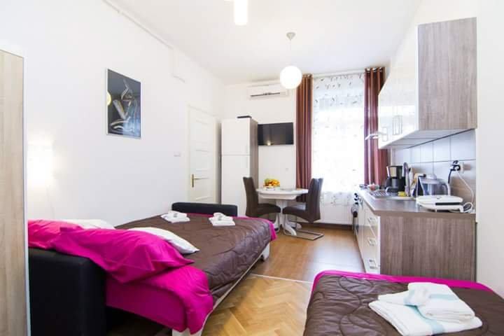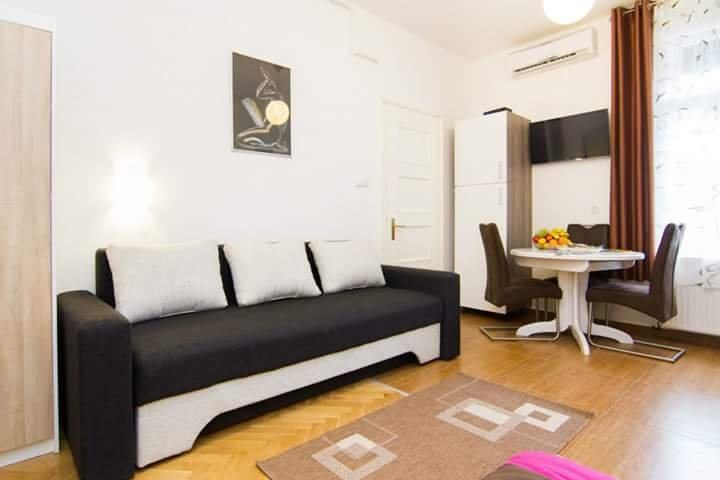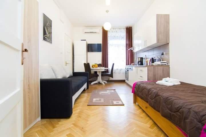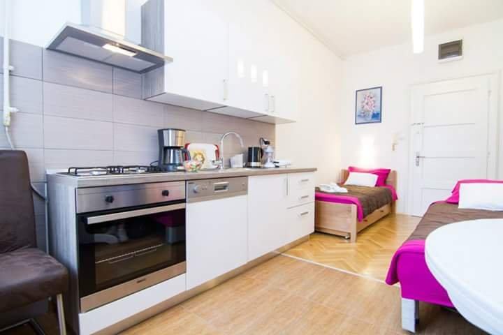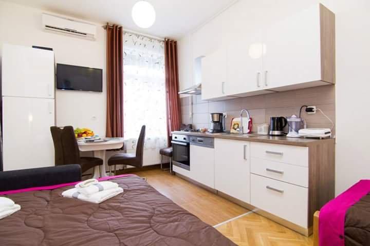 Iznajmljuje se moderno namještena garsonjera na četvrtome katu zgrade sa liftom u užem centru grada.