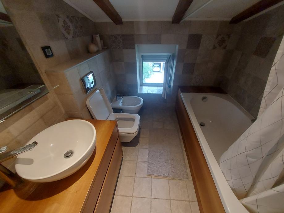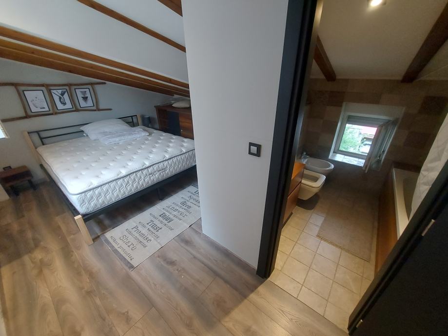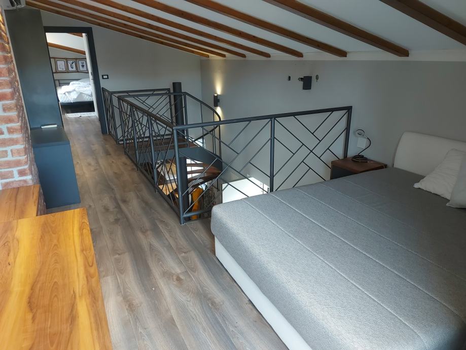 Galerija: prostor s bračnim krevetom i garderobnim ormarima, spavaća soba, kupaonica s kadom.
