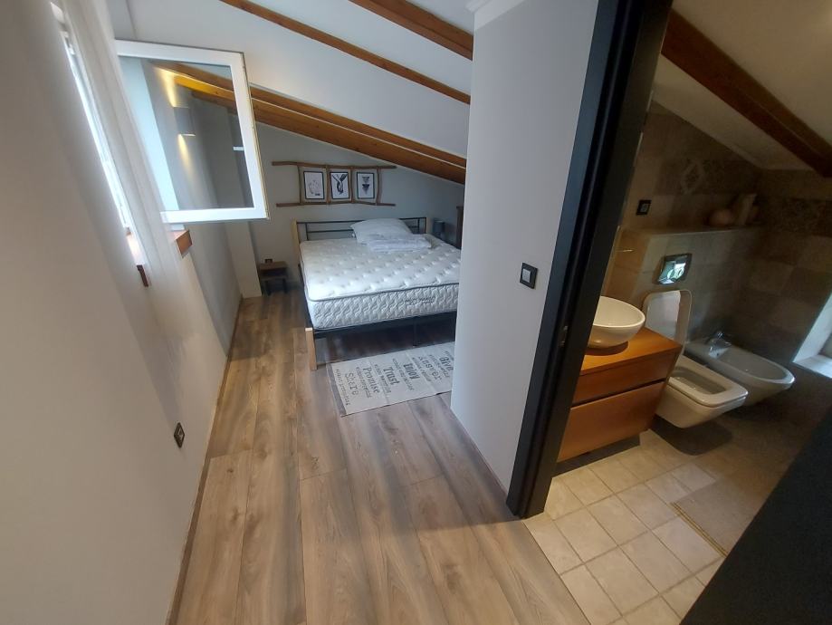 Ground floor: entrance, living room, kitchen with dining room in open-space concept, bathroom with shower, terrace. Attic: 2 bedrooms and an bathroom with tub.