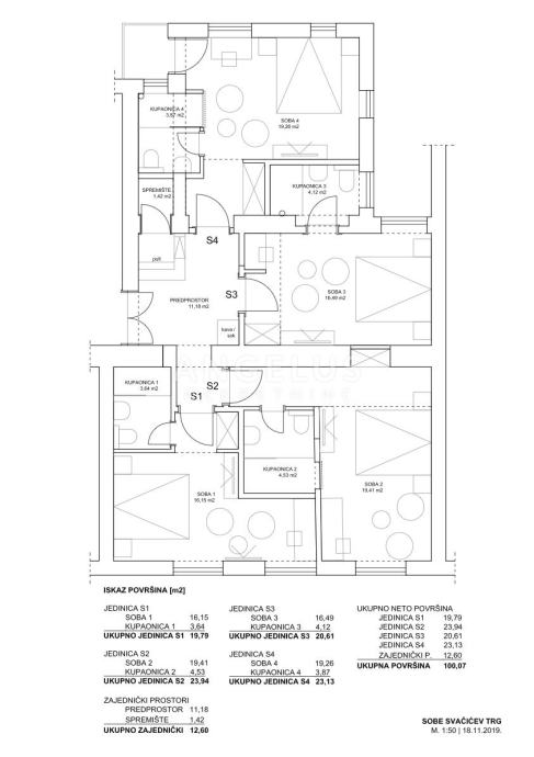 Stan se nalazi na prvom katu uređene zgrade s štukaturama, te ima manju recepciju iz koje se ulazi u 4 velike odvojene luksuzne sobe s kupatilima. Dvije sobe južne orijentacije imaju otvoren pogled na park, dok sjeverna soba ima svoj manji balkon. Svakoj sobi pripada veća kupaonica i wc te su do sada bile u intenzivnom najmu do konstrukcije obnove. Grijanje i hlađenje regulirano je dizalicama topline. Stan je upisan kao poslovni prostor ali na fizičku osobu tako da se jednostavno može, po potrebi, preinačiti u stan. Stanu pripada i vanjska šupa, isto tako renovirana u konstrukcijskoj obnovi, koja se nalazi u zadnjem dvorištu. Zbog svoje mikro lokacije u samom centru gradu te provedenih instalacija i luksuznog uređenja ova nekretnina je prava prilika za vašu investiciju.