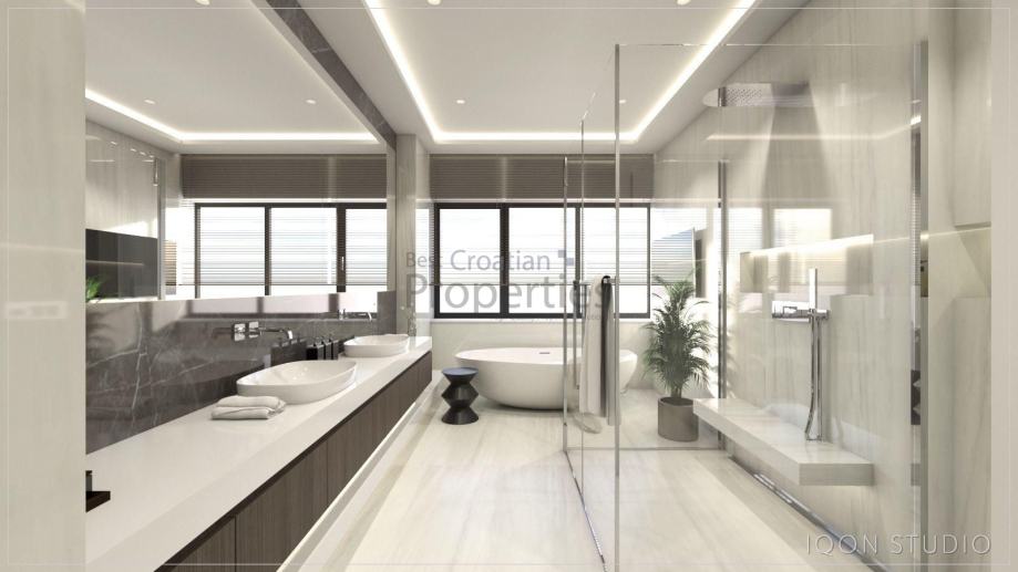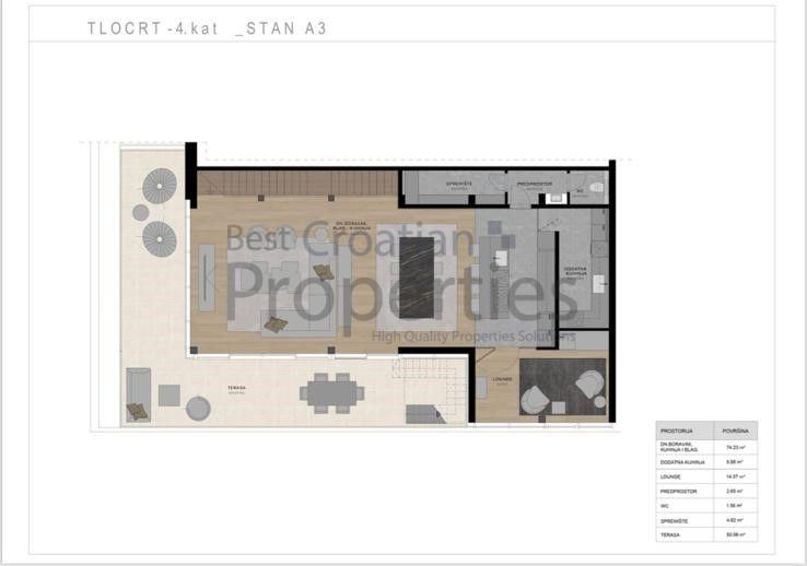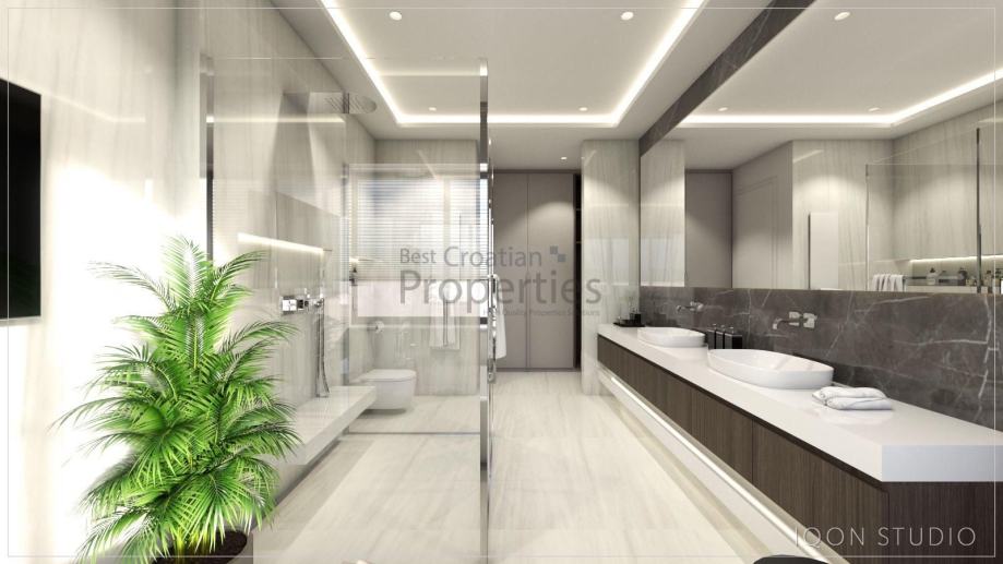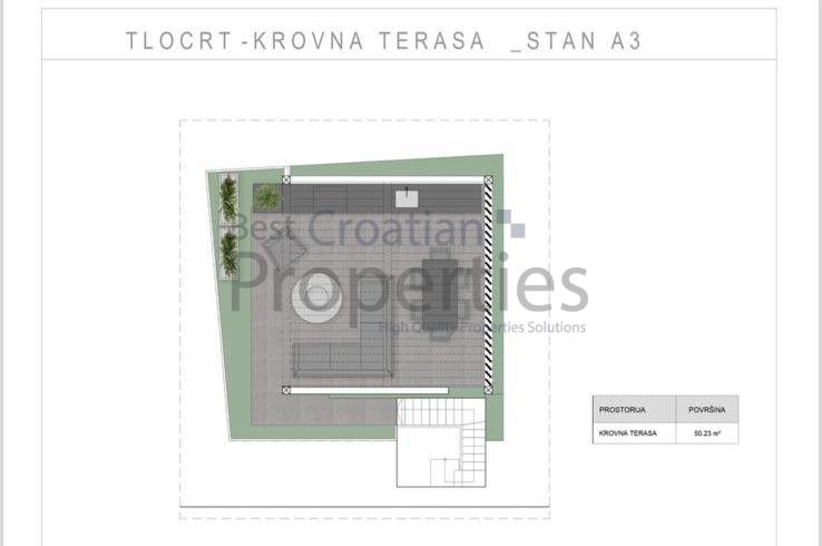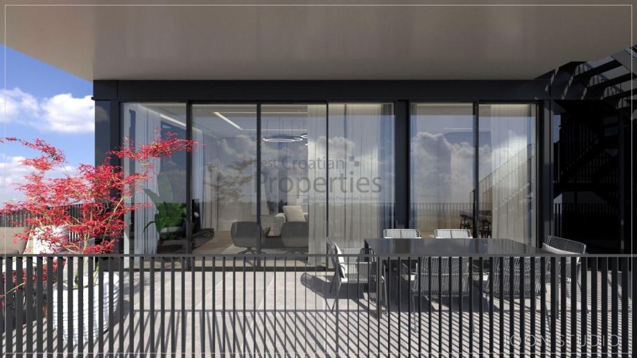 Stan ima 291m2 i uz njega dolaze 4 parkirna mjesta. Nalazi se na trećem i četvrtom, ujedno posljednjem katu zgrade iz 2024. , te mu pripada i krovna terasa.