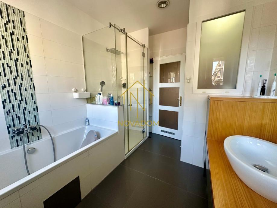 Stan se sastoji od: velikog i svijetlog dnevnog boravka s kaminom (visina stropa 3,20m), velike blagovaone povezane s kuhinjom (open-space koncept), 2 prostrane sobe s ugradbenim ormarima, prostrane kupaone s tušem i kadom (podno grijanje), zasebnog WC-a i 2 balkona.