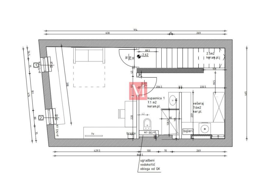 podrum - otvoreni prostor s mogućnošću prilagodbe raznim namjenama (ured, fitness, vinski podrum...), kupaonica, vešeraj