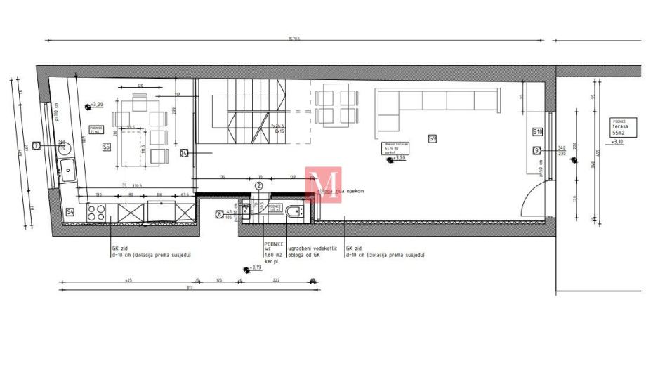 prvi kat - open space dnevni boravak s kuhinjom i blagovaonicom s izlazom na terasu (19,75m2) i vrt (47m2)