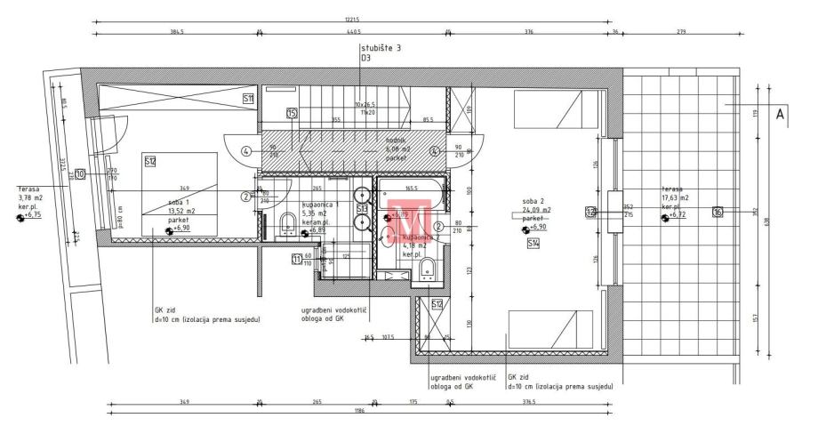 drugi kat - hodnik, master spavaća soba s kupaonicom i terasom (3,75m2), dvije spavaće sobe s kupaonicom i terasom (11,42m2)