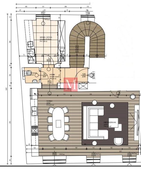 donja etaža (2. kat): ulazni hodnik, prostrani dnevni boravak s kuhinjom i blagovaonicom, toalet, gospodarska prostorija / vešeraj