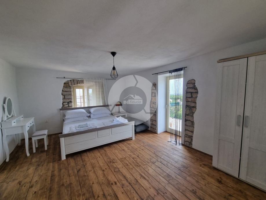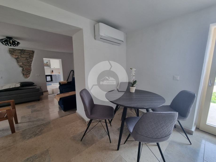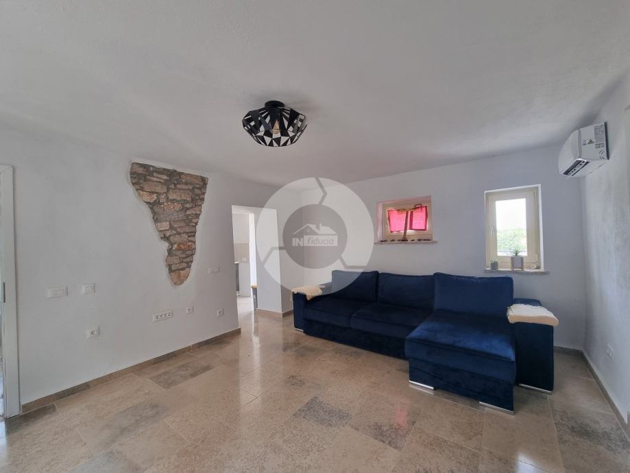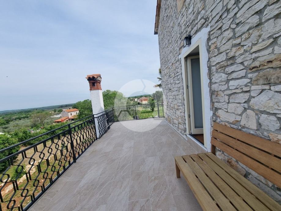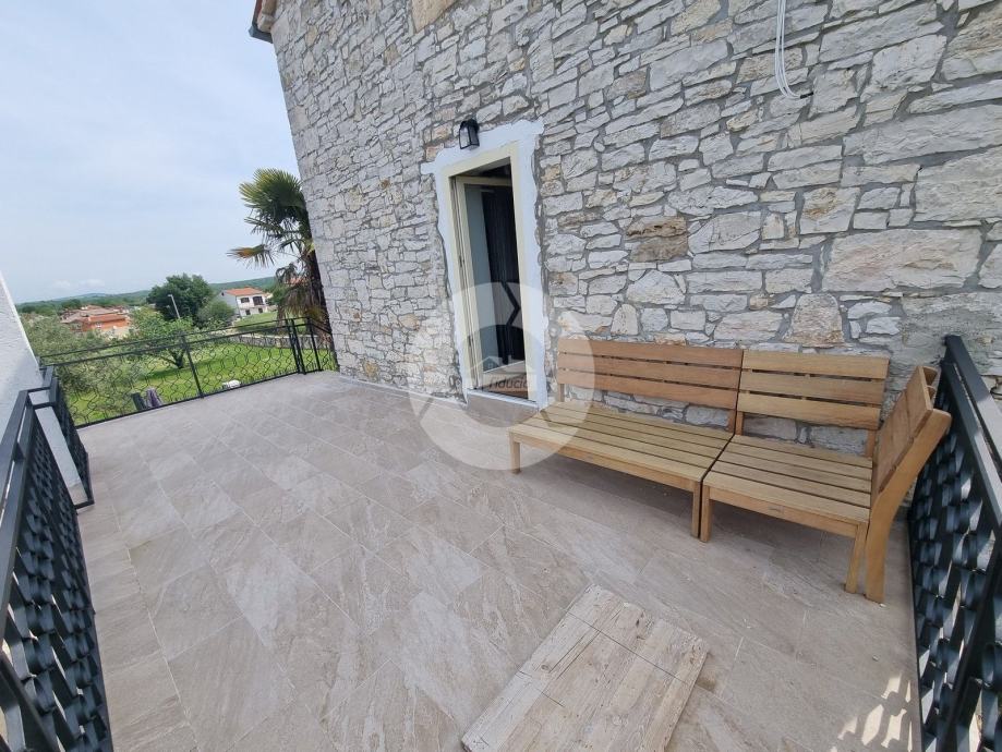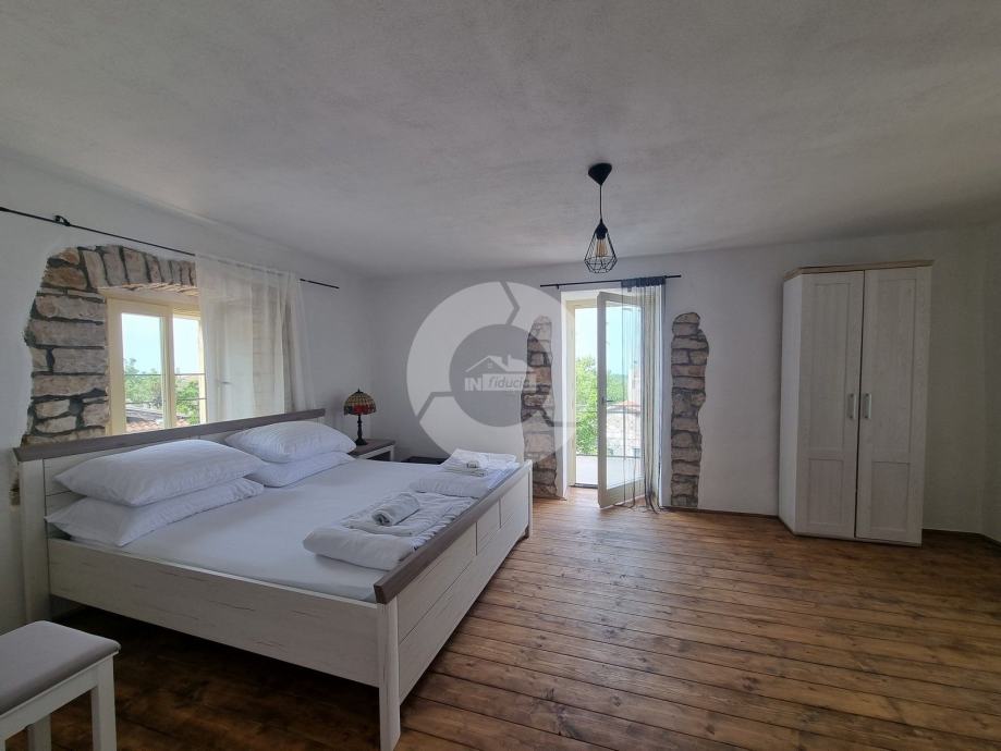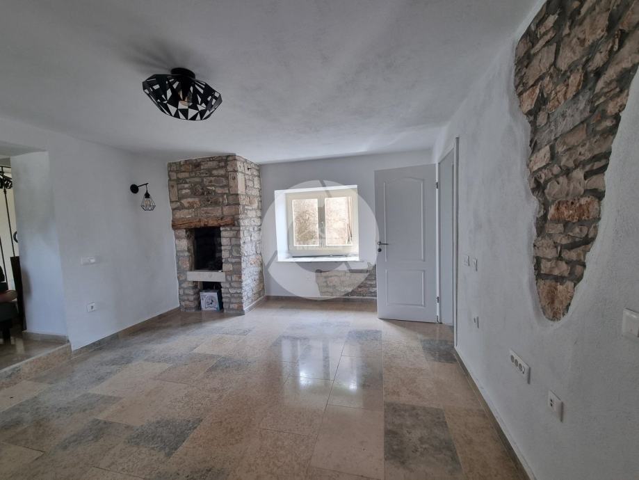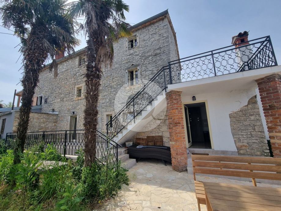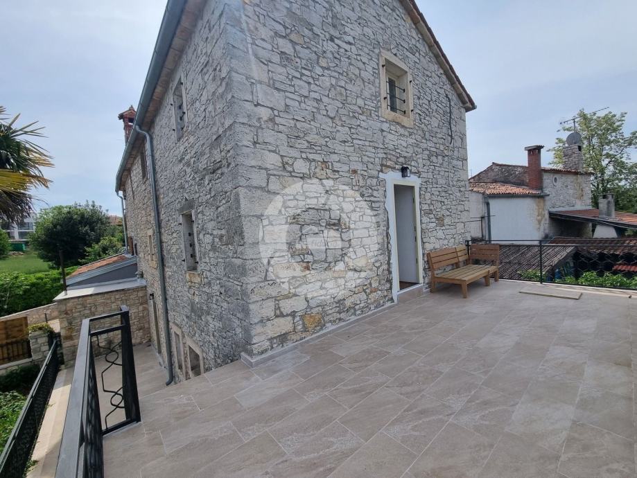 Šarmantna kamena ljepotica nalazi se u centru malog istarskog gradića nadohvat svih sadržaja, svega 3 km od uređenih plaža. Kuća nije samostojeća, veže se samo jednom stranom uz drugu kuću. Kuća je izgrađena prije 1968 godine a renovirana je 2022. godine, te opremljena namještajem i opremom. U vrtu postoji i bazen, te vanjski roštilj i parkirna mjesta. Sastoji se od tri etaže: prizemlja, prvog kata i visokog potkrovlja. U prizemlju se nalazi blagovaone, kuhinja, veliki dnevni boravak sa kamenom te kupaona. Unutarnjim stepenicama se odlazi na kat gdje su dvije spavaće sobe (jedna veća i jedna manja), te kupaona. Iz veće sobe se izlazi na prostran balkon sa kojeg se pruža otvoreni pogled na more i prirodu, a povezan je vanjskim stepenicama i sa vrtom. U visokom potkrvolju su još dvije spavaće sobe (jedna veća i jedna manja, bez terase), i kupatilo. Grijanje/hlađenje regulirano je klima uređajima, dok u dnevnog boravku postoji kamin za zimski ugođaj. Kuća se prodaje sa namještajem i opremom!