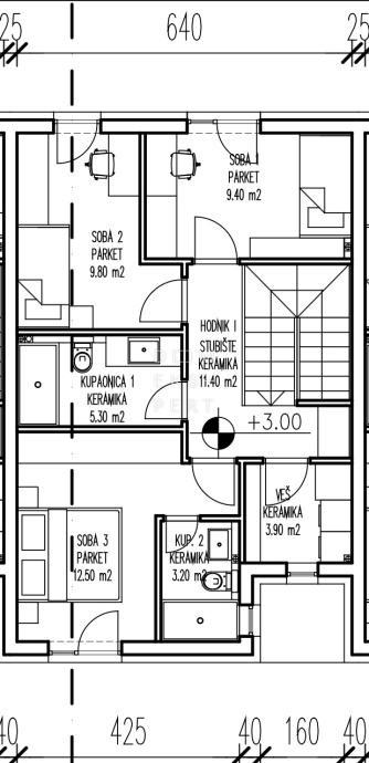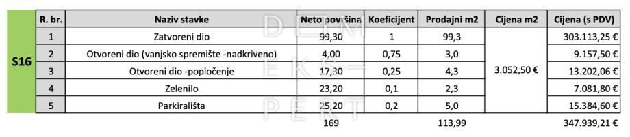Stambena površina iznosi 99 m², a sa svim pripatcima obračunatim po koeficijentima, ukupna površina iznosi 114 m².