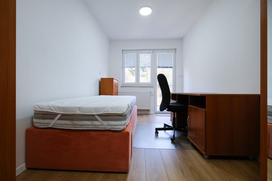 Iznajmljuje se lijepo uređen 3-soban građanski stan površine 84 m2 preko puta parka Ribnjak, na 4. (zadnjem) katu stambene zgrade (bez lifta) u srcu grada.