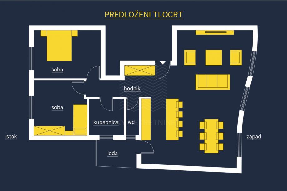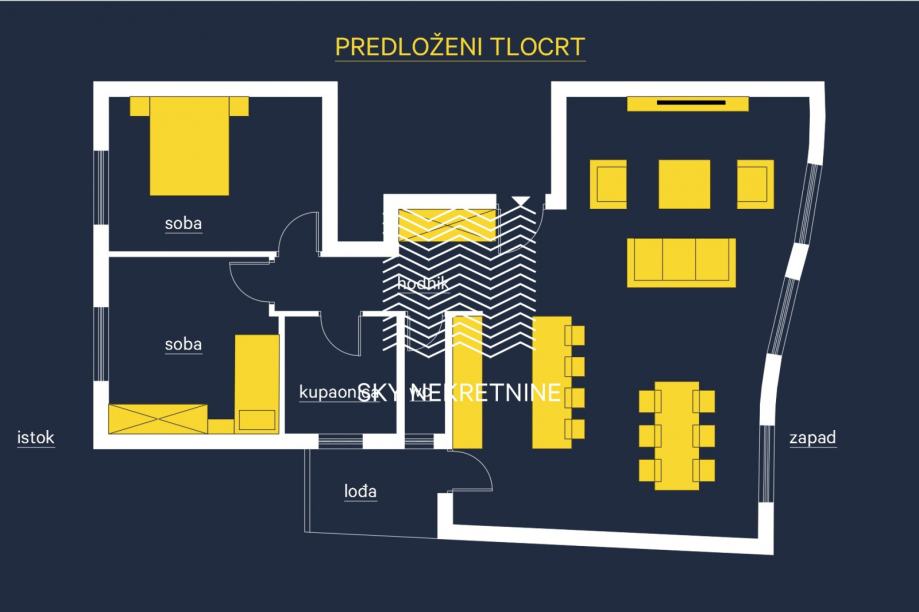 Većina zidova u dnevnom boravku nije nosiva i moguće je napraviti veliki open space prostor od 47m2, te u tom slučaju imati 2 spavaće sobe. Druga opcija je pretvoriti trenutnu blagovaonicu u 3. spavaću sobu čime dnevni boravak ostaje u trenutnim dimenzijama.