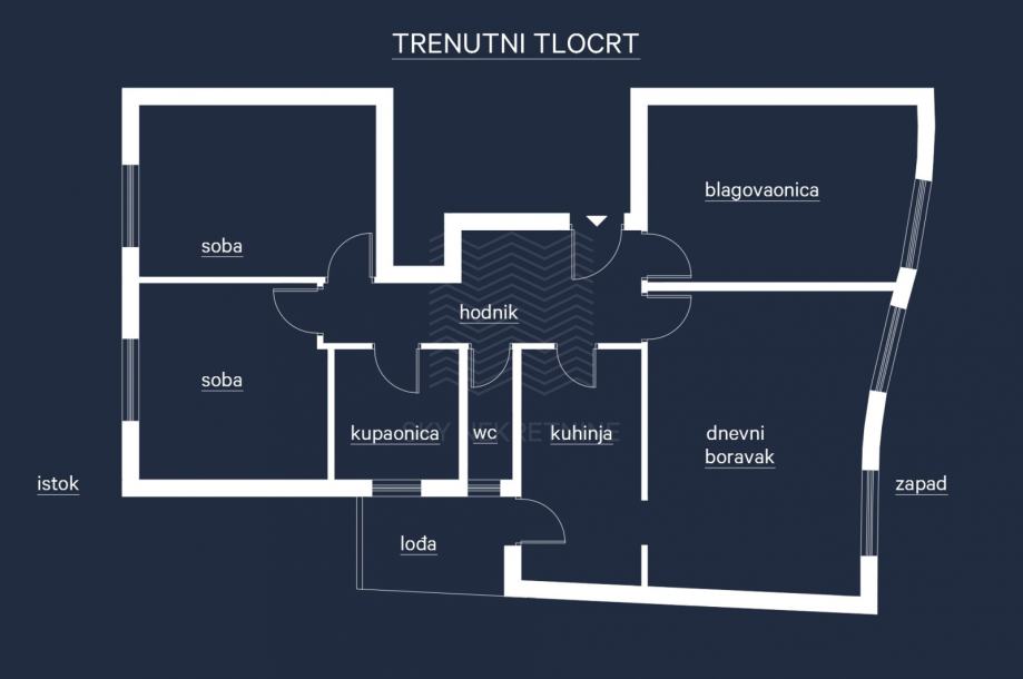 Priložen je trenutni tlocrt i predloženi tlocrt kojim se postiže open space dnevni boravak s kuhinjom i blagovaonicom.