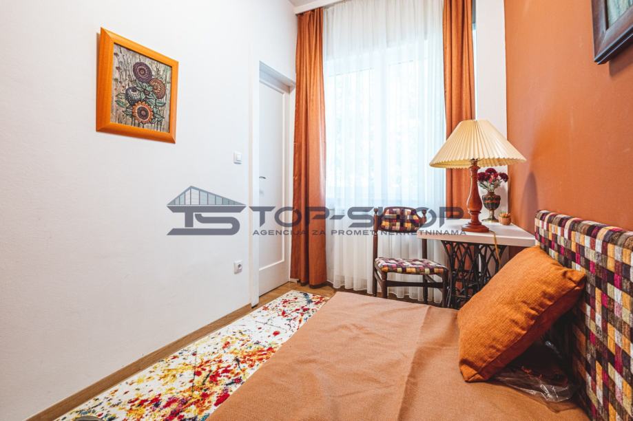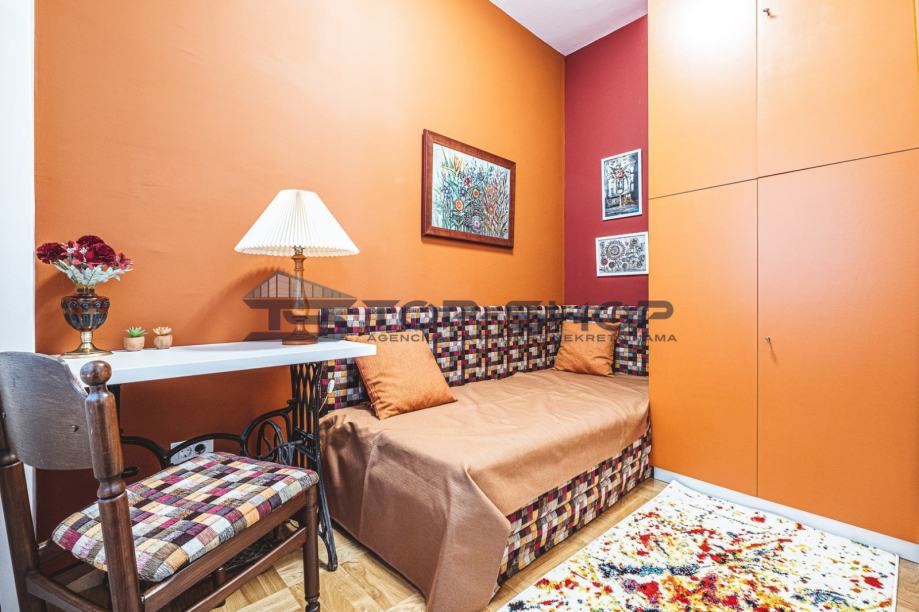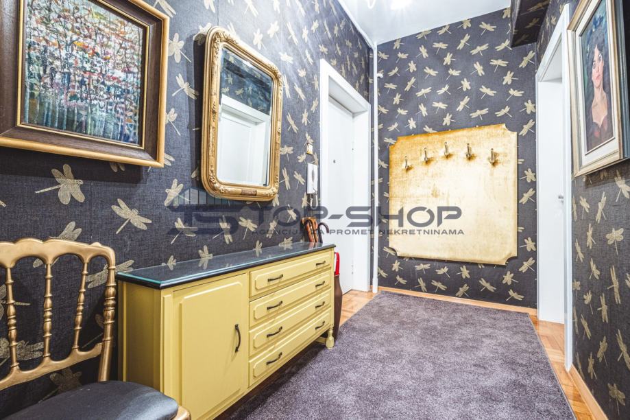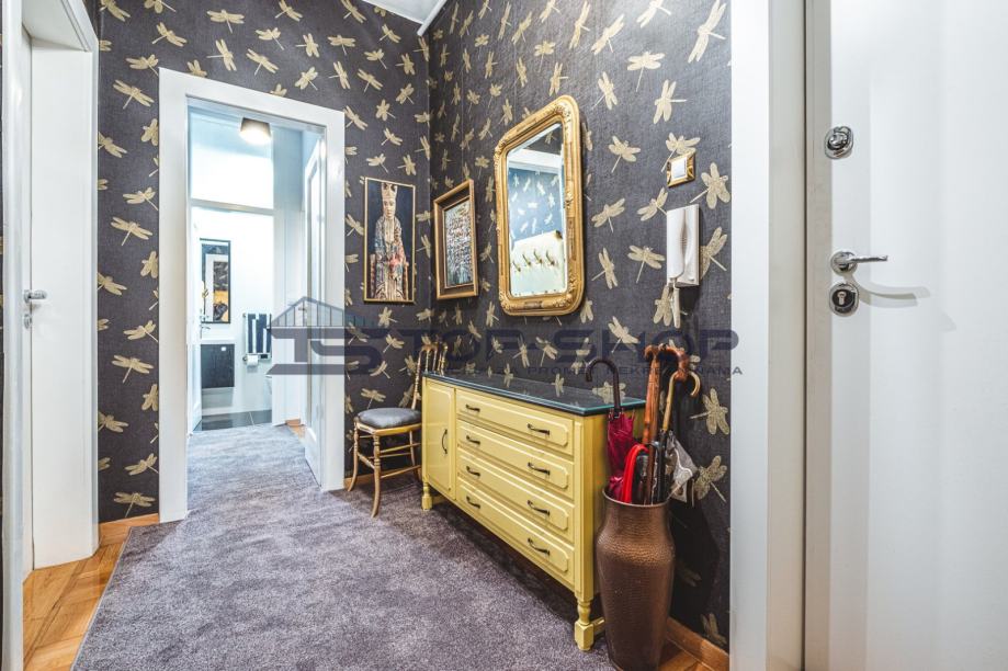 Stan se sastoji od prekrasnog, velikog dnevnog boravka s pogledom na katedralu, te od još dvije prostorije koje su uređene kao dnevni boravak/blagavaonica, od jedne velike spavaće sobe te jedne male, nekad djevojačke sobe. Stan ima novouređenu, luksuznu kuhinju sa svim potrebnim aparatima, te modernu kupaonicu.