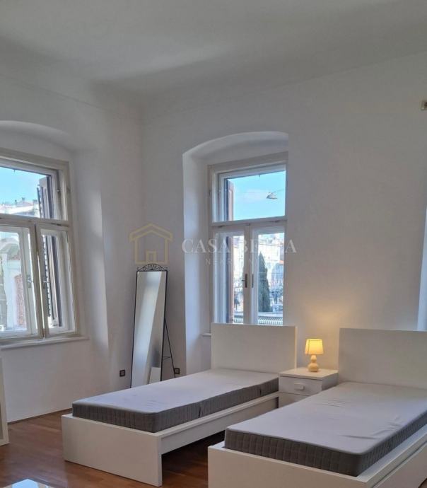 CASA BELLA nekretnine iz ponude izdvaja prvom katu zgrade u centru grada iznajmljuje se stan površine 55 m². Stan se sastoji od jedne spavaće sobe, dnevnog boravka, kuhinje s blagovaonicom i kupaonice. Opremljen je klimom.