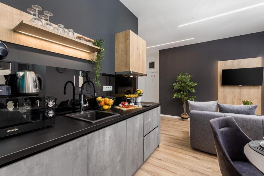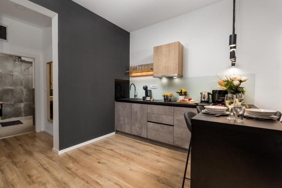 Stan od 135 m² podijeljen je u tri jednosobna apartmana, svaki s vlastitim balkonom – rijetkost na tržištu. Svi apartmani su moderno uređeni, potpuno renovirani i opremljeni najnovijom tehnologijom te vrhunskim namještajem.