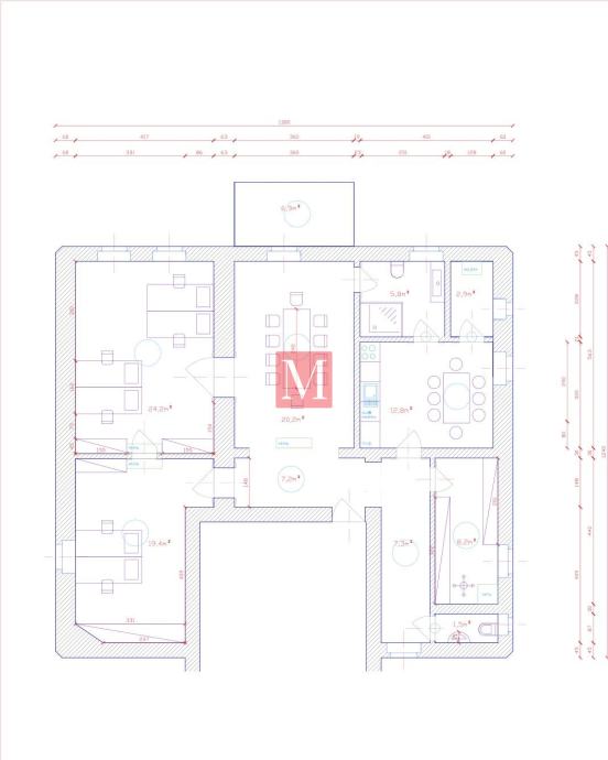 Sastoji se od ulaznog hodnika, centralne prostorije koja je idealna kao soba za prijem stranaka, čekaonica ili soba za sastanke, zatvorene loggie te 2 velike sobe, arhive, kuhinje sa blagovaonom, spremišta, kupaonice sa WC-om i zasebnog wc-a.