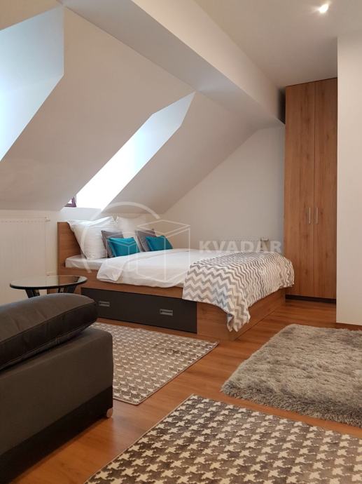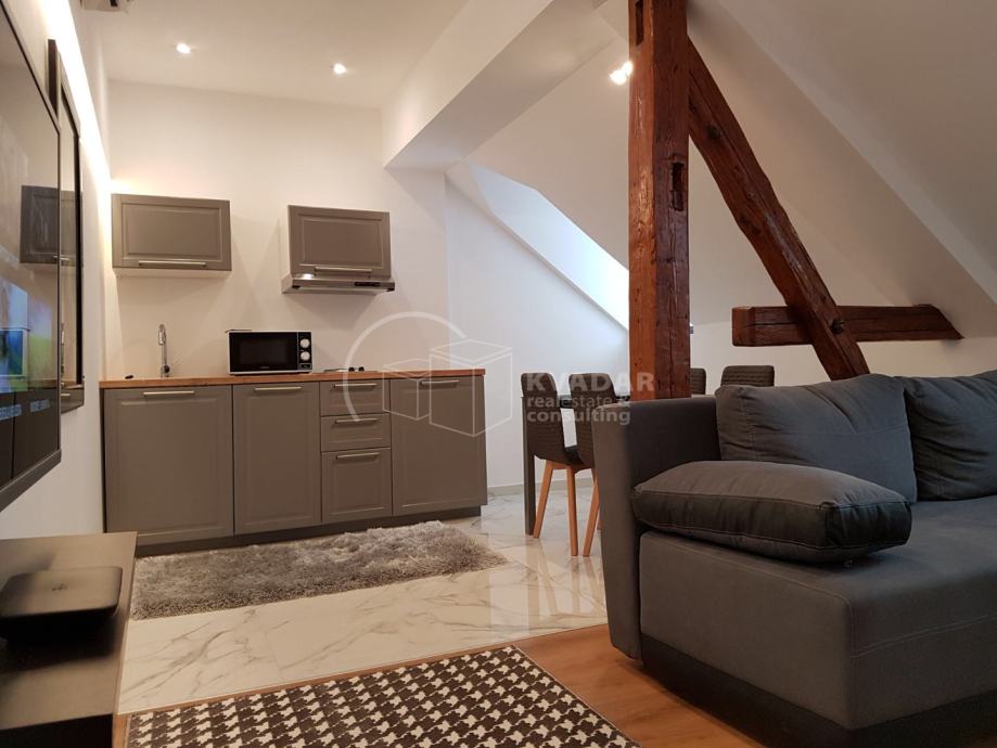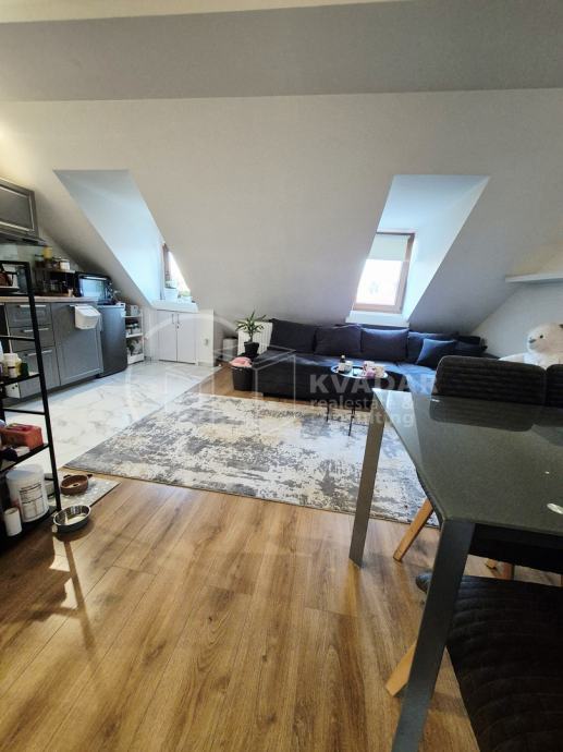 Stan je u potkrovlju zgrade bez lifta, površine 72m2 (podno 87m2) i organiziran je kao dvije potpuno odvojene stambene jedinice, sa kompletno opremljenim kuhinjama i kupaonicama. Veća stambena površina ima i zasebnu spavaću sobu. Oba stana su trenutno u najmu.