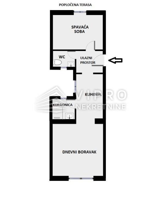 Stan se tlocrtno sastoji od ulaznog prostora, prolazne prostorije povezane s otvorenim prostorom (kuhinja, dnevni boravak), odvojene sobe, kupaonice s walk-in tušem, odvojenog toaleta te pripadajuće terase u dvorištu površine cca 12m2.