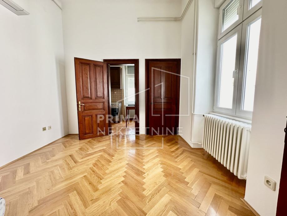Trosoban građanski stan ukupne površine 95.60 m2 u visokom prizemlju stambene zgrade u Žerjavićevoj ulici u centru Zagreba.